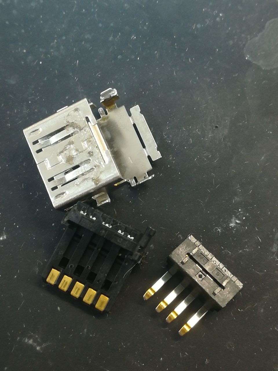 Было принято решение разобрать USB разъём полностью и восстановить его. Разобрали, убрали окислы внутри, всё тщательно промыли в ультразвуковой ванне. К счастью, сами контакты не были окислены. После обратной сборки разъём снова заработал.