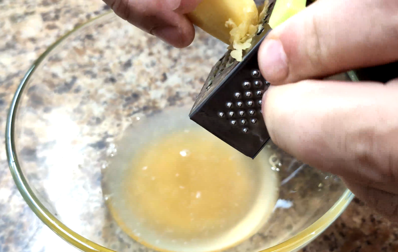 В это время сделаем глазурь. Смешиваем мёд и сок лимона, к которым натираем на мелкой терке свежий имбирь. Получившейся глазурью поливаем верхушку индейки, когда она постоит 5-7 минут в духовке. Сначала поливаем половиной глазури, а через 5 минут поливаем остатками и ждём ещё минут 5. После чего достаём индейку и даём ей отдохнуть минут 5-7.