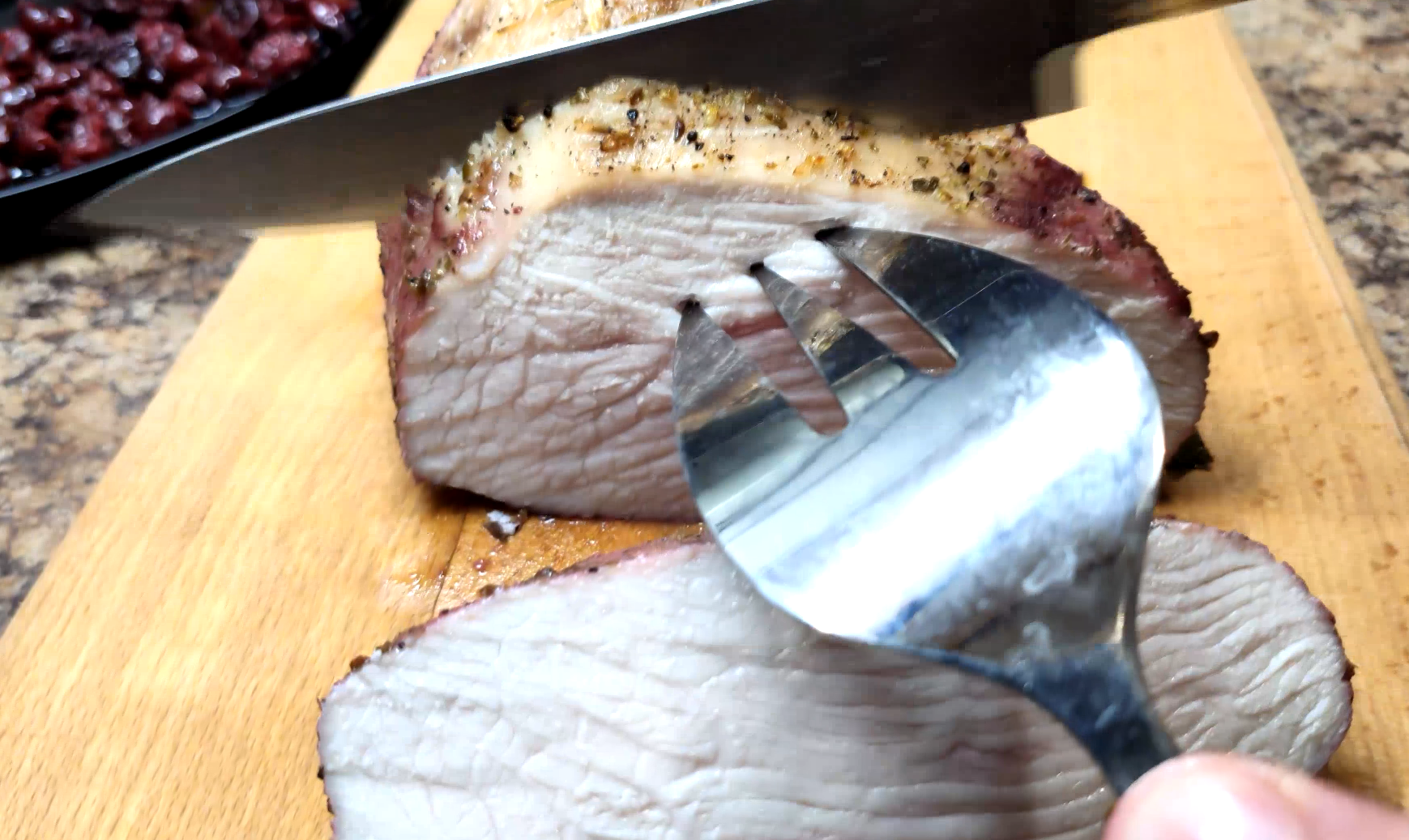 С лотка аккуратно аккуратно снимаем фольгу и сразу наслаждаемся нереальным ароматом. Это очень аппетитно. Вокруг индейки выкладываем свежую (без костей) или размороженную вишню. Отправляем обратно в духовку на 5-7 минут. В этот раз уже без фольги.