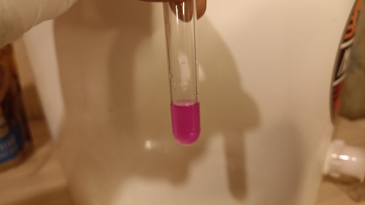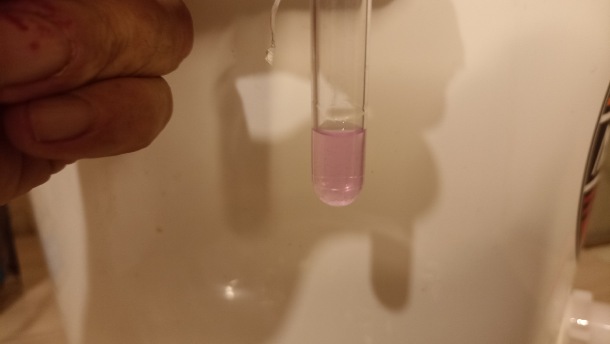 Вот этот фото сделал уже ближе к концу отбора голов. Как пишет производитель - если самогон содержит около 0,03 мг/л альдегидов, то окраска будет слегка розового цвета при добавлении 5 капель индикатора голов самогона к одному миллилитру самогона. Вроде как получилось слегка розовый цвет.