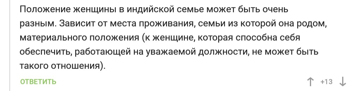 Основываясь на полученных мною ответах разных респондентов, я сделала вывод, что во многих местах Индии отношение к женщине сугубо утилитарное. Воспринимается как прислуга, козел отпущения, существо бесправное и права голоса в семье не имеющее.