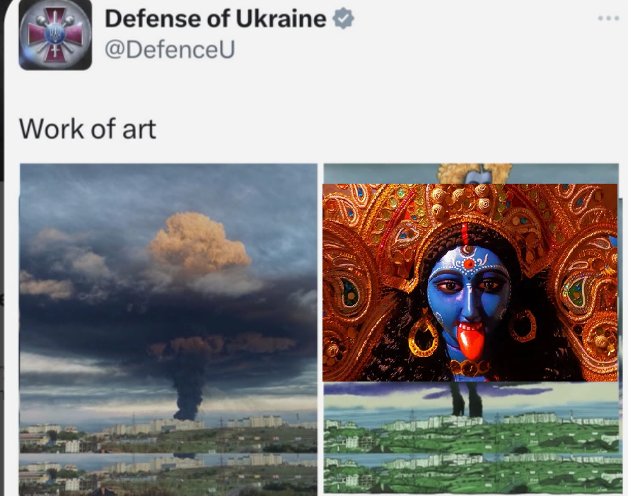 Причиной является карикатура на богиню Кали, стилизованную под Мерлин Монро, юбка которой – фотография дыма после атаки беспилотников на нефтебазу в Севастопольской бухте и подпись по-английски "Произведение искусства" - размещенная в официальных аккаунтах.