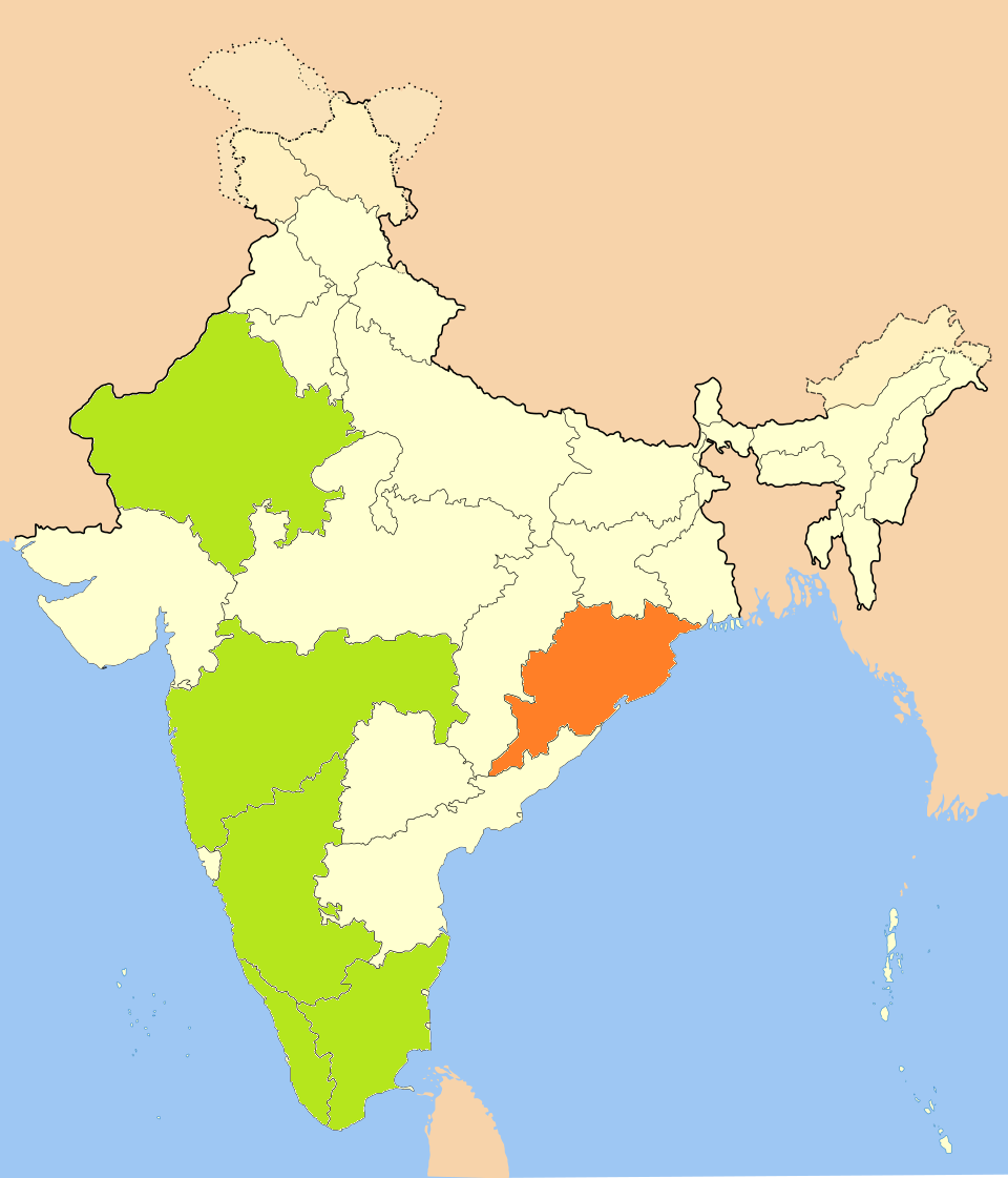 На этой карте я отметила штаты, про которые уже писала зелёным и Одишу оранжевым.