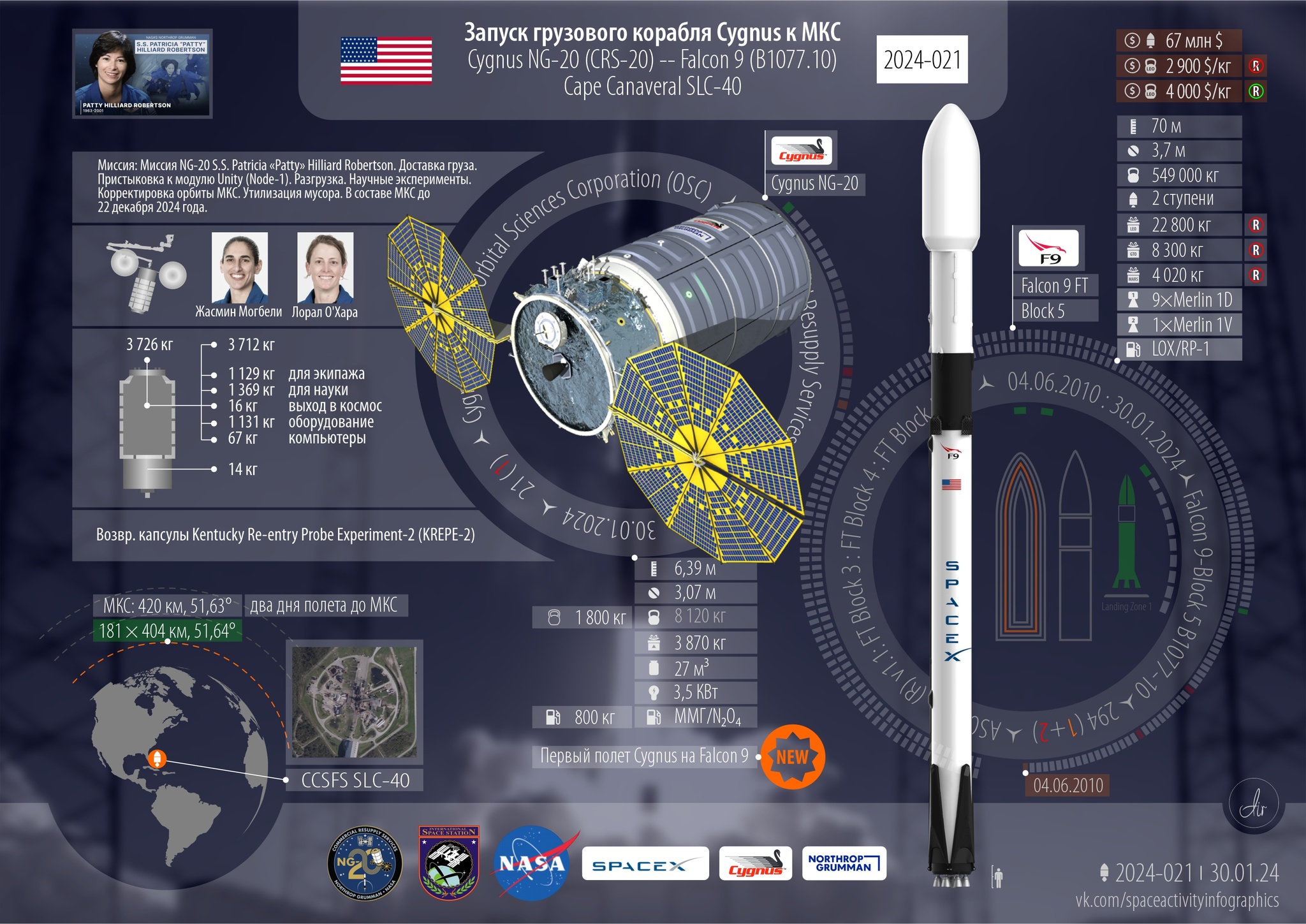 3 Airlibra Космическая движуха Серия Инфографика (мои картинки) Инфографика миссии Cygnus NG-20 1 год назад Вячеслав Ермолин, 30 января 2024 года Инфографика миссии Falcon 9 Block 5 | Cygnus CRS-2 NG-20 (S.S. Patricia “Patty” Hilliard Robertson) Ссылка на изображение в высоком разрешении [моё] Запуск ракеты SpaceX Космонавтика Технологии Ещё 0