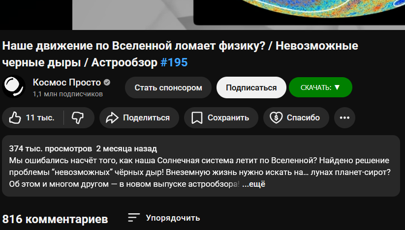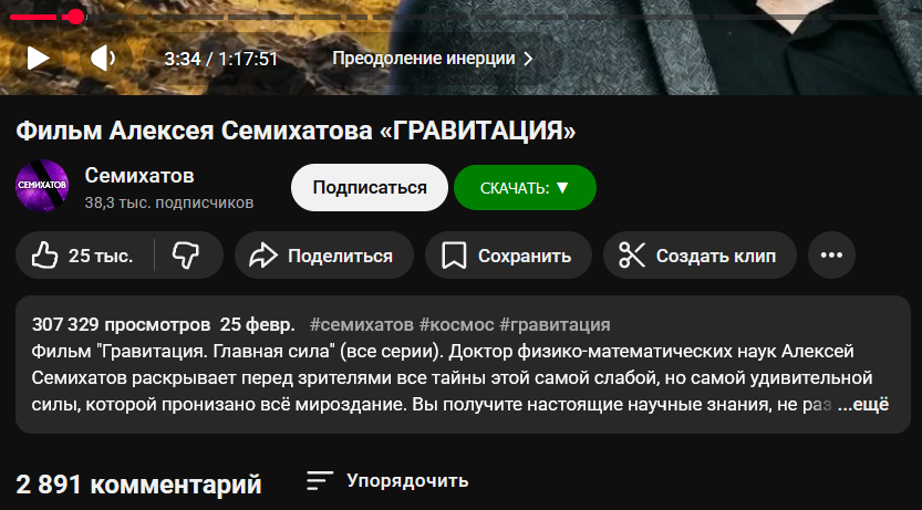 А есть, для сравнения, замечательный канал "Космос Просто" с 1.1 млн подписчиков, у которого видео реально набирают по 300-400 тыс просмотров, но за все время существования видео: