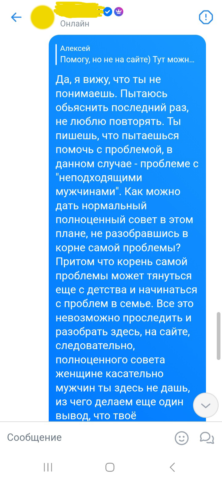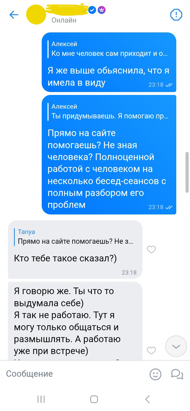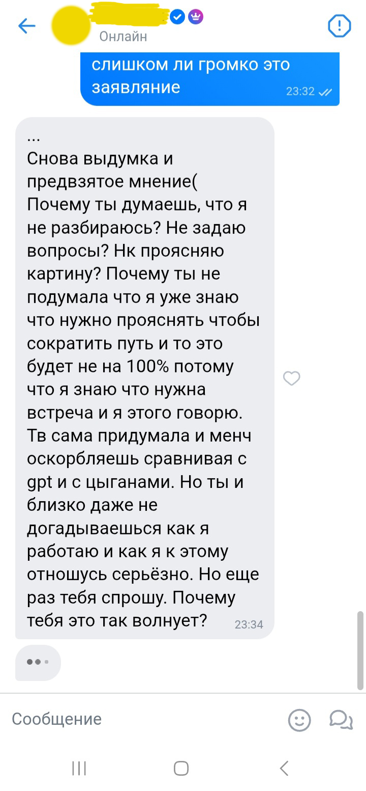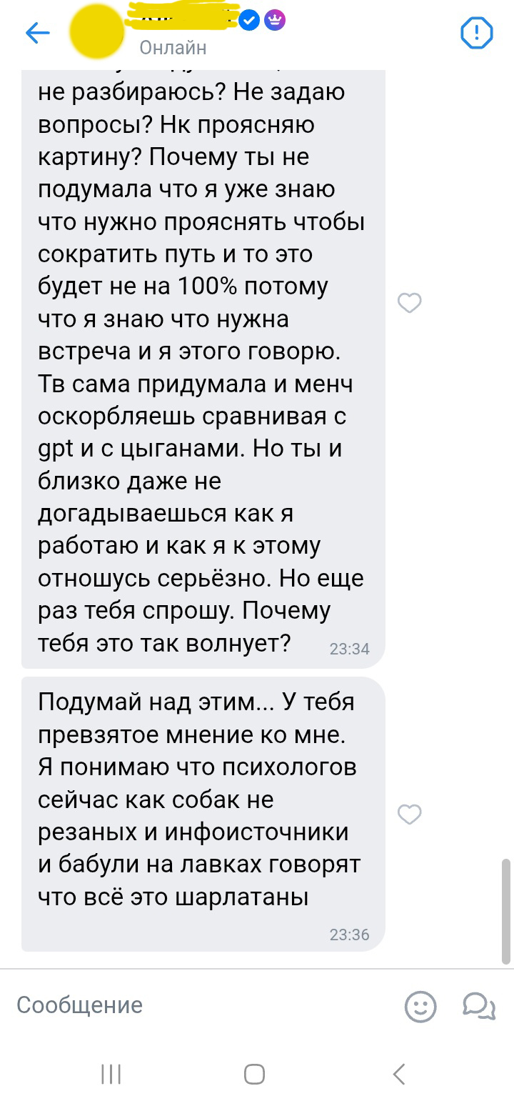 Почему я к нему прицепилась? Потому что все это реально кажется мне инфоцыганством. Я тоже могу написать в анкете, что я психолог, и копировать собеседникам ответы ИИ (притом иногда совсем неплохие). Лично я считаю, что полноценную работу с проблемами человека можно провести только путем множественных встреч и разговоров. Да, он пишет, что результат будет не на 100 %, потому что нужна встреча, но, блин, встреча нужна всегда! Только так можно проработать проблему и вообще найти ее корень, чтобы помочь человеку, иначе советы яжпсихолога ничем не будут отличаться от советов чата gpt. Более того, они могут навредить спрашивающему, потому что нет зрительного контакта, это блин сз, а не онлайн-консультация, человек может выразиться "своими словами", психолог неправильно его поймет и даст неправильный совет. И человек будет опираться на него.