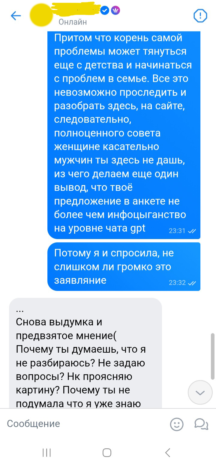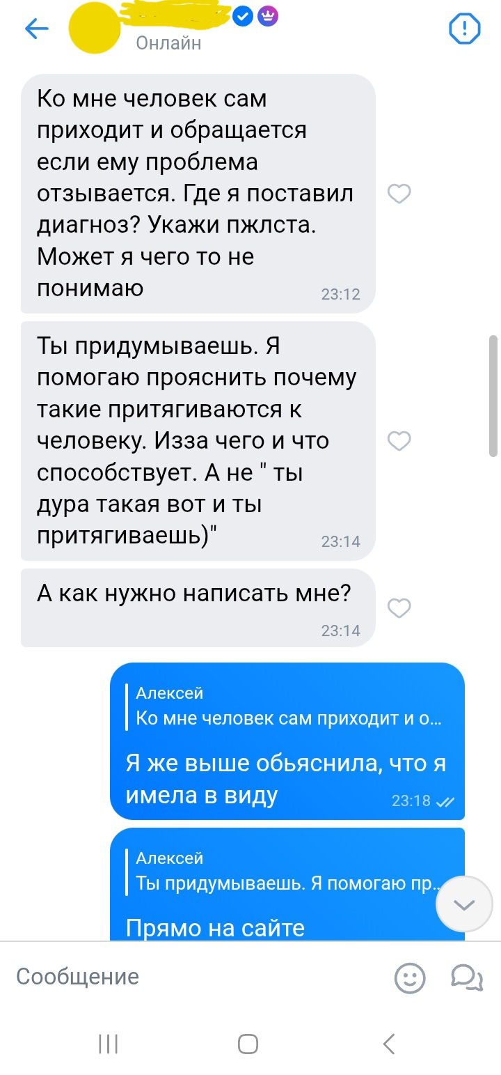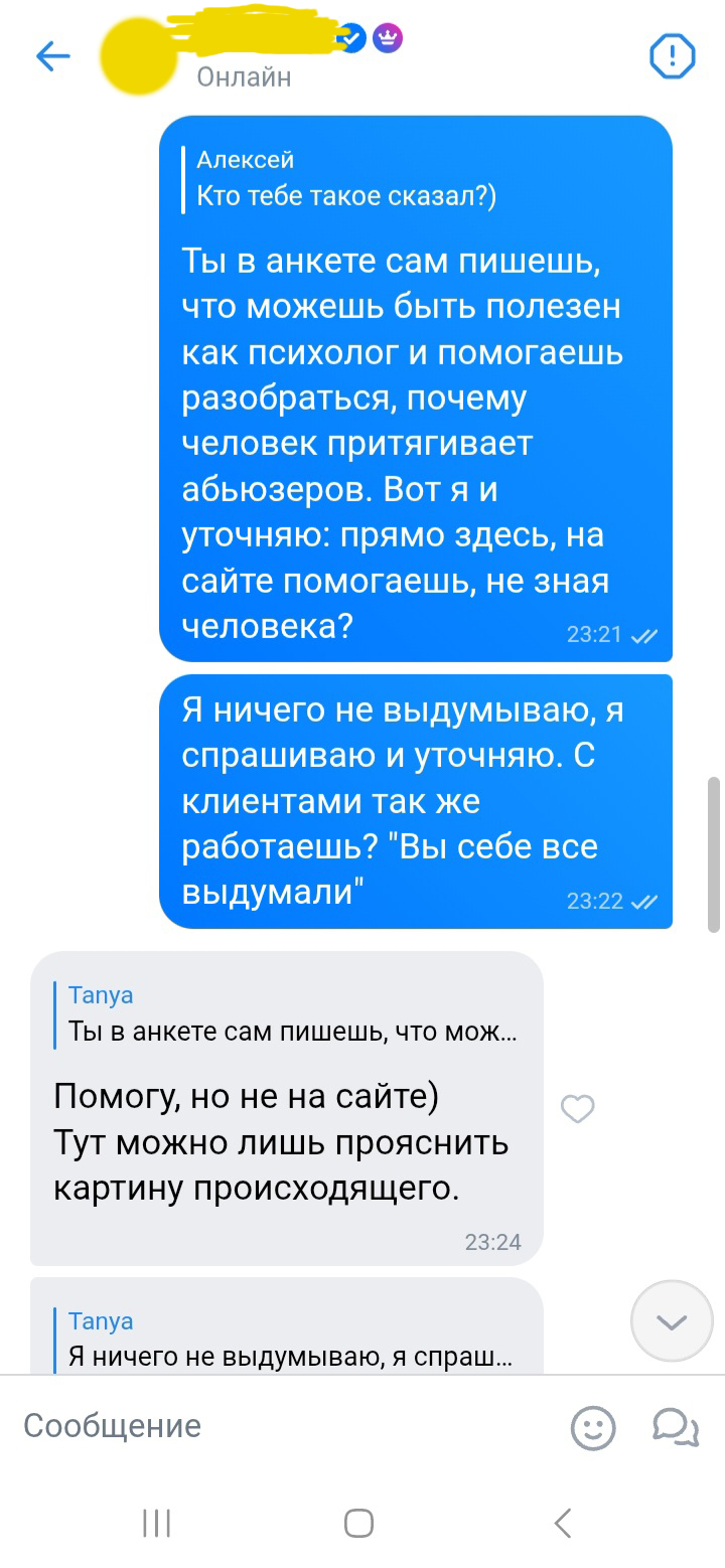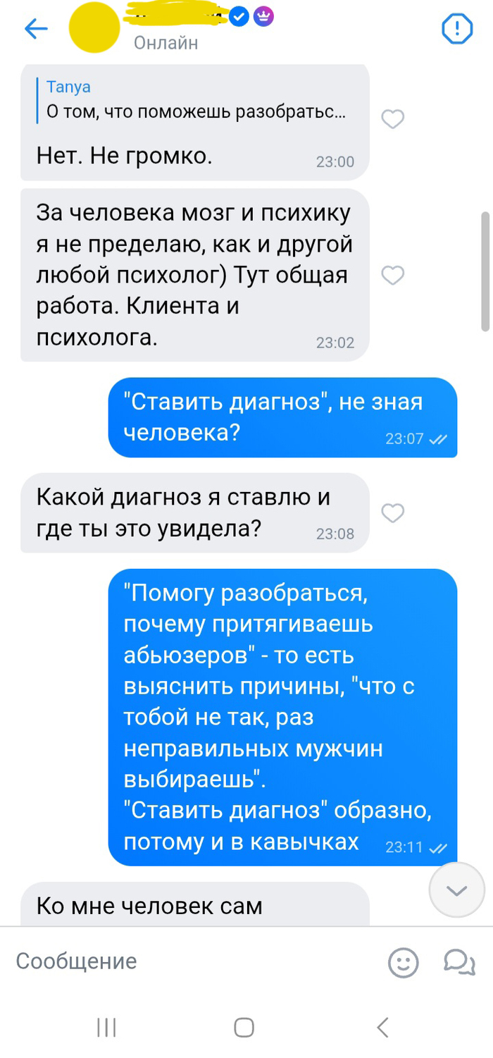 Почему я к нему прицепилась? Потому что все это реально кажется мне инфоцыганством. Я тоже могу написать в анкете, что я психолог, и копировать собеседникам ответы ИИ (притом иногда совсем неплохие). Лично я считаю, что полноценную работу с проблемами человека можно провести только путем множественных встреч и разговоров. Да, он пишет, что результат будет не на 100 %, потому что нужна встреча, но, блин, встреча нужна всегда! Только так можно проработать проблему и вообще найти ее корень, чтобы помочь человеку, иначе советы яжпсихолога ничем не будут отличаться от советов чата gpt. Более того, они могут навредить спрашивающему, потому что нет зрительного контакта, это блин сз, а не онлайн-консультация, человек может выразиться "своими словами", психолог неправильно его поймет и даст неправильный совет. И человек будет опираться на него.