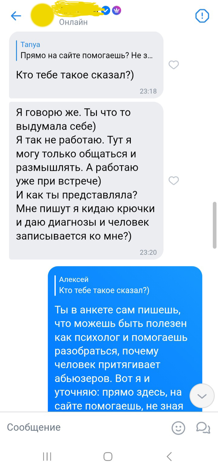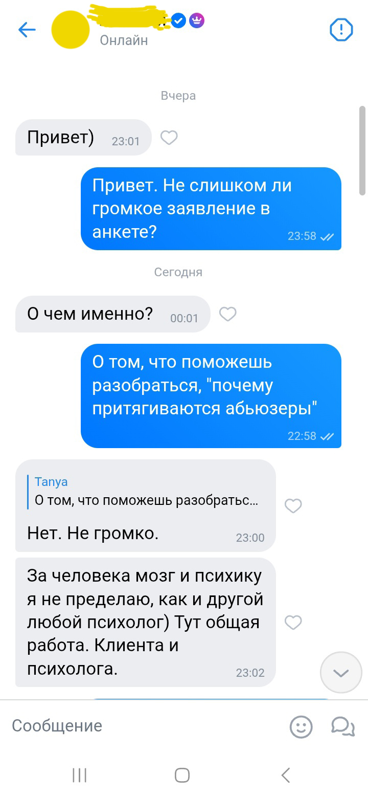 Заскринить саму анкету не успела, так как человек удалил меня в середине диалога, но позиционировал он себя как психолог (это было указано в графе "кем работаете"). Ему 33 года, в анкете было написано примерно так: "Ищу открытого легкого общения, серьезные отношения временно не интересуют. А пока могу быть полезен для тебя как психолог и помогу разобраться, почему притягиваешь абьюзеров)".