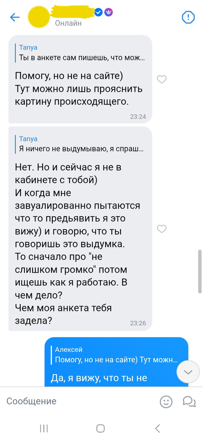 Ответить я не успела, потому что диалог исчез (собеседник удалил чат), едва я прочитала последнее сообщение и сделала скрин. Остальные скрины сделала чуть раньше, пока ждала ответ. Зачем я их сделала, если сейчас сомневаюсь, права или нет? Как раз по этой причине.
