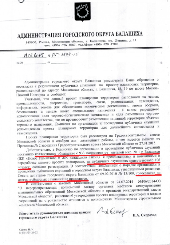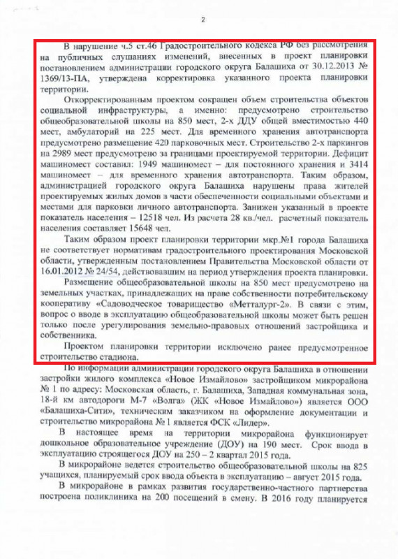 Видите, что написано? Без публичных слушаний, с нарушением Градостроительного кодекса РФ местные власти тупо взяли и утвердили антисоциальные корректировки проекта планировки микорайона. Прямым текстом Минстрой Подмосковья признаёт, что тем самым был сокращён объём строительства объектов социальной инфраструктуры, образовался дефицит более 5,3 тыс. машиномест, и что администрация Балашихи нарушила права жителей. Более того, занижен и расчётный показатель населения - более чем на 3 тыс. чел.! Хоть кто-то понесёт за это ответственность?