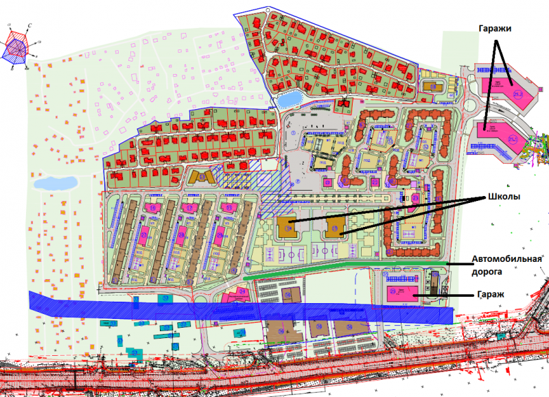 Вот подробнее, как это выглядело на проекте строительства инженерных сетей и сооружений микрорайона (2011 год). Здесь мной отмечено то, на что рассчитывали люди, покупая квартиры в этом жилом комплексе - те самые две школы, многоуровневые гаражи более чем на 7 тыс. машиномест, объездная автомобильная дорога.