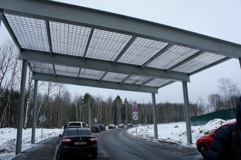Тросы также проходят над проезжей частью, защищённой, видимо, от падения наледи специальной сеткой. А то вдруг машину какую-нибудь пробьёт.