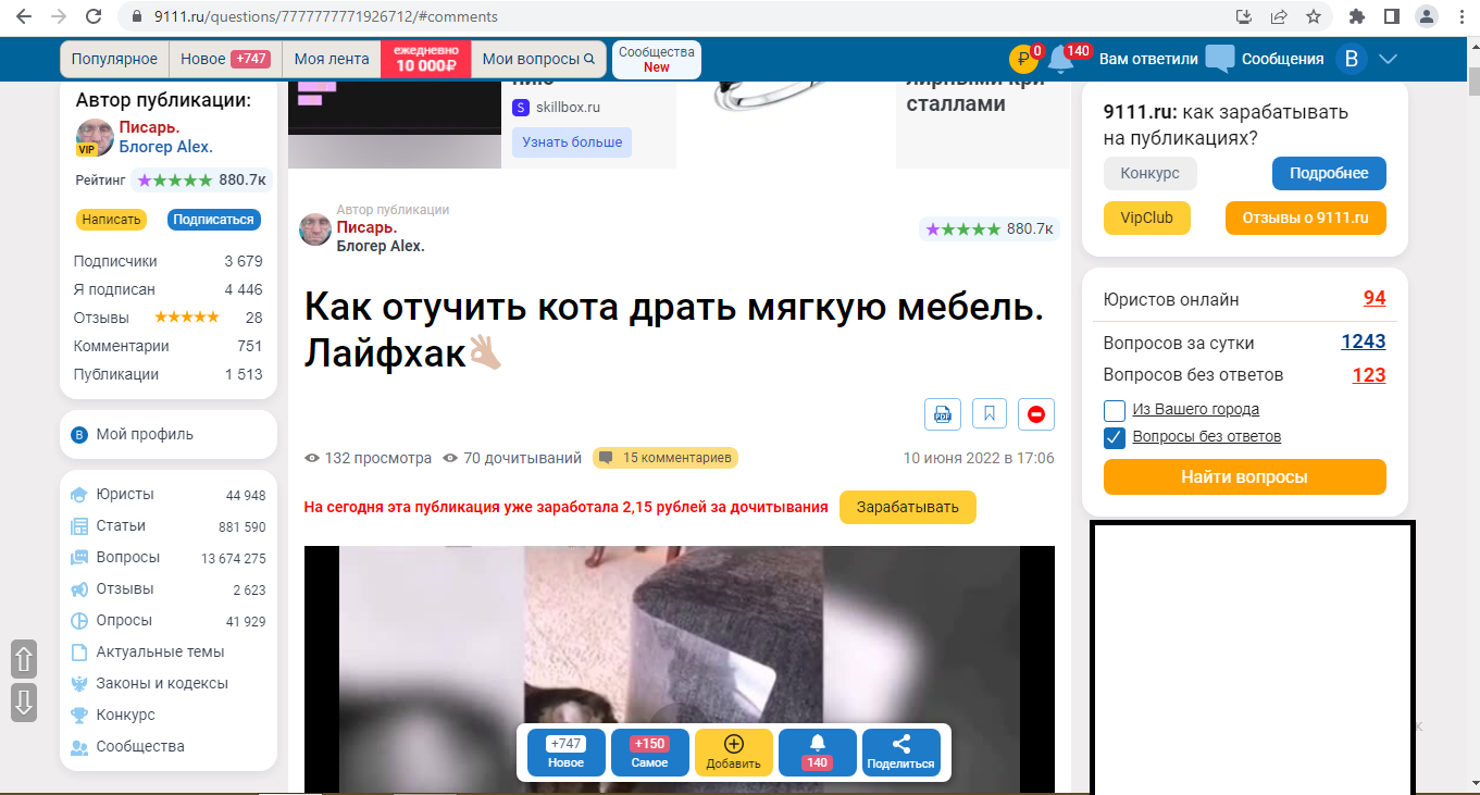 Много различного публикуется в сети: приколы, руководства по заведению автомобиля, и много чего другого. Здесь писарь диктует как отучить кода драть мягкую мебель, а практикующий юрист, миллионник в рейтинге, ставит на досуге примечательный "класс".