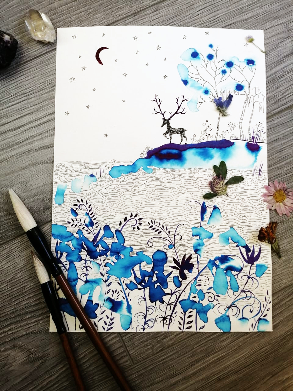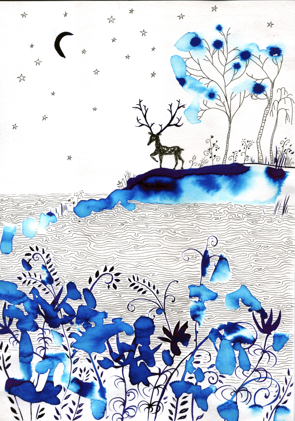 Олень так олень. Посреди фантастического голубого пейзажа, при блеске темной луны.