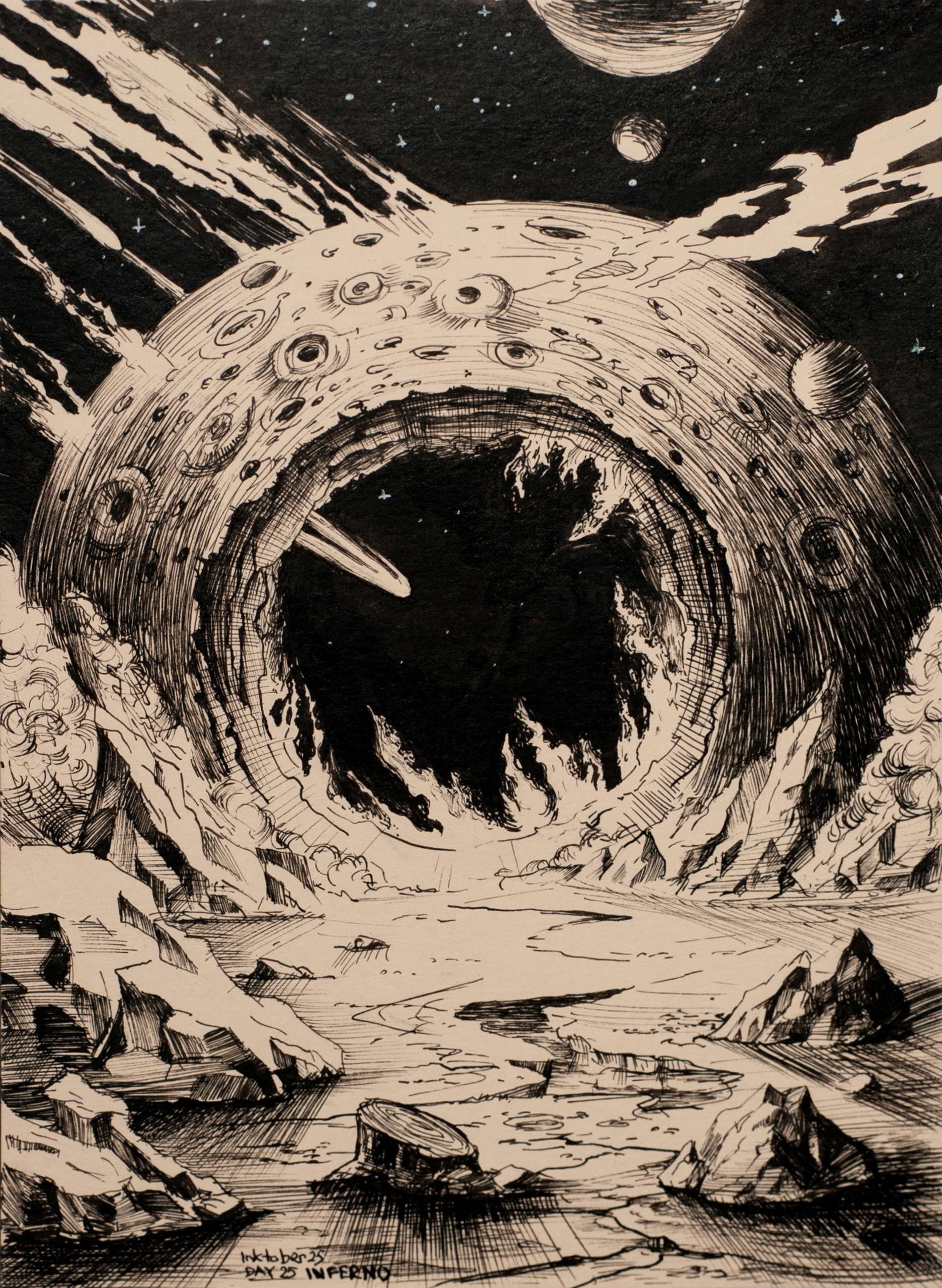 Inferno. Мне посоветовали отличную идею - ад внутри, а ещё напомнили про тему Инферно у И. Ефремова. На ефремовское мне точно скиллов не хватит. Кстати, у меня есть старая советская книга "Час быка" Ефремова, следующим постом покажу иллюстрации оттуда. Черно-белые, но просто фантастические по рисунку и видению!