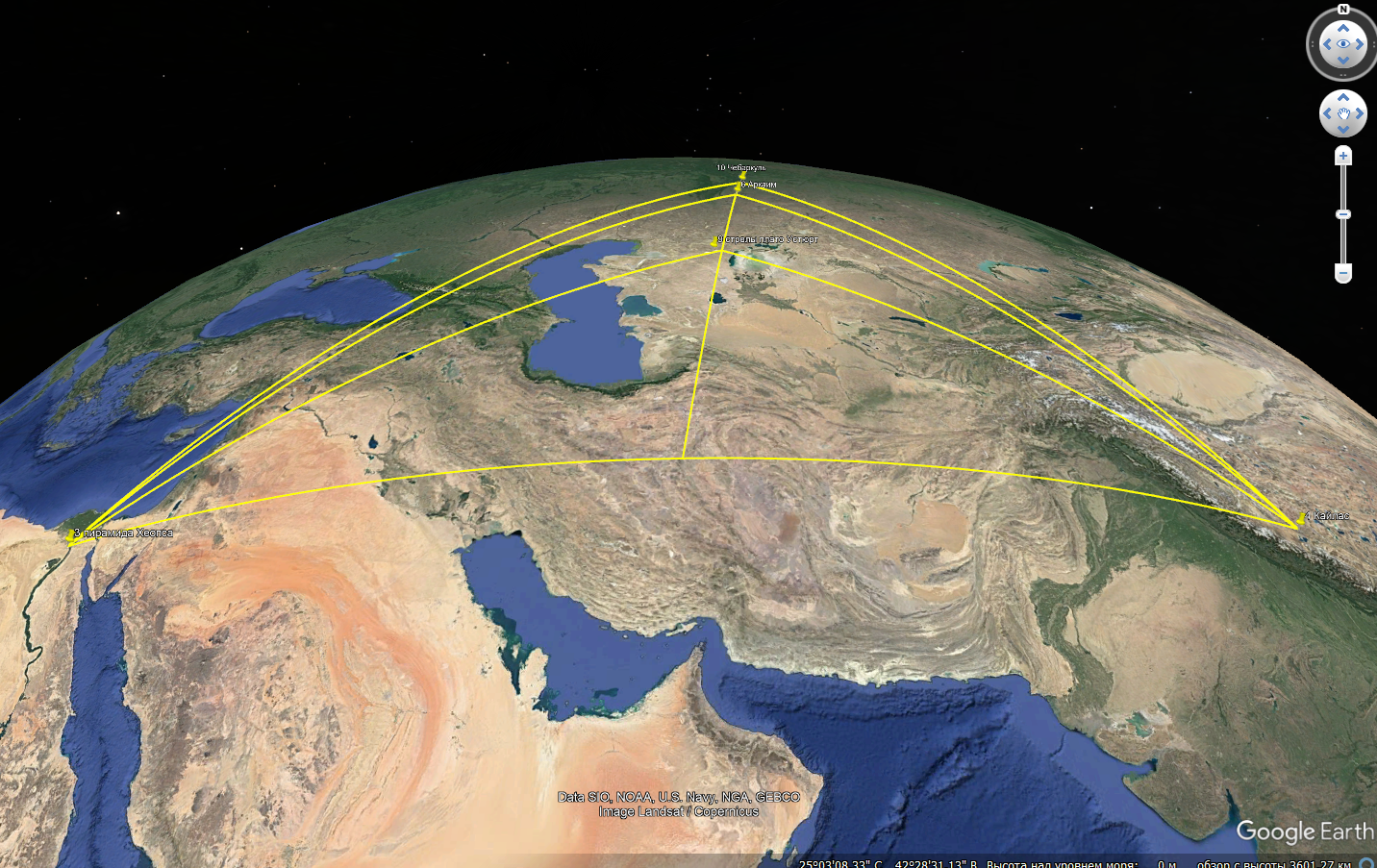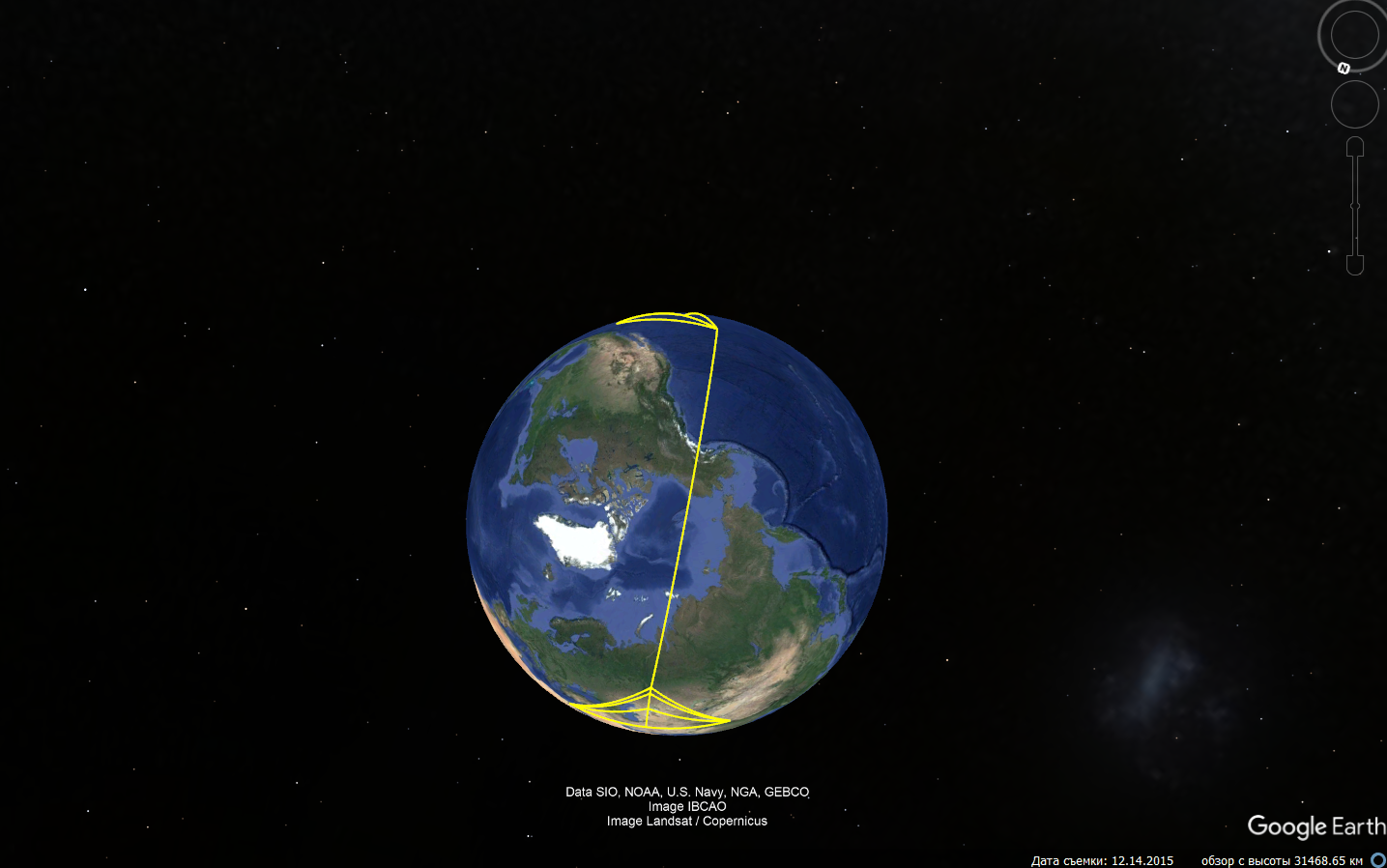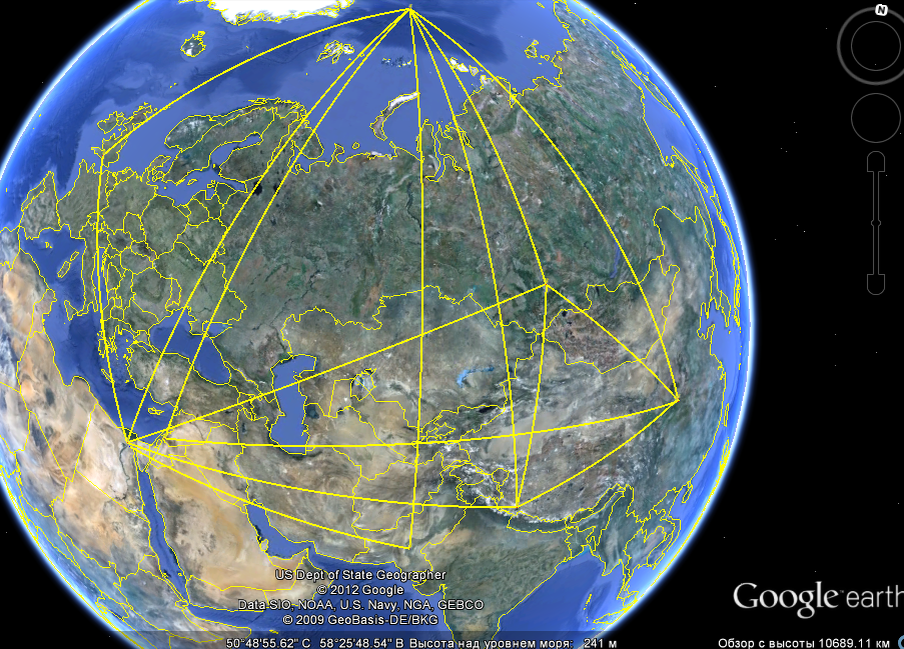 А теперь рассмотрим следующую картинку, как результат построений в программе Google Earth (рис. 4). Все координаты взяты из Википедии.