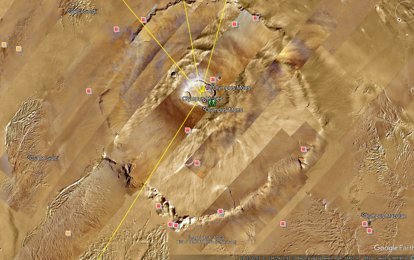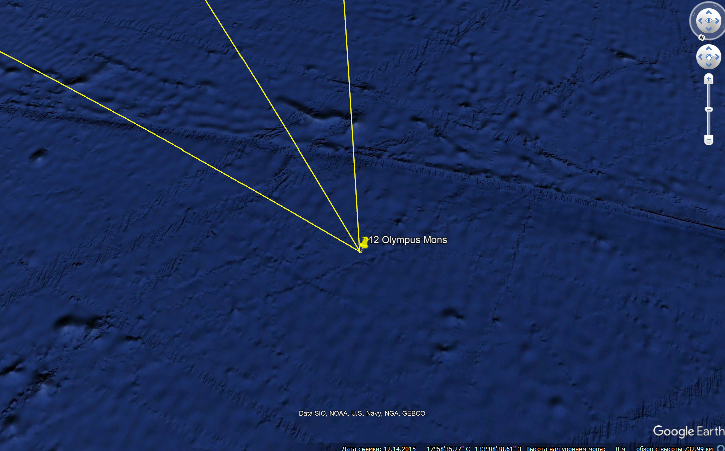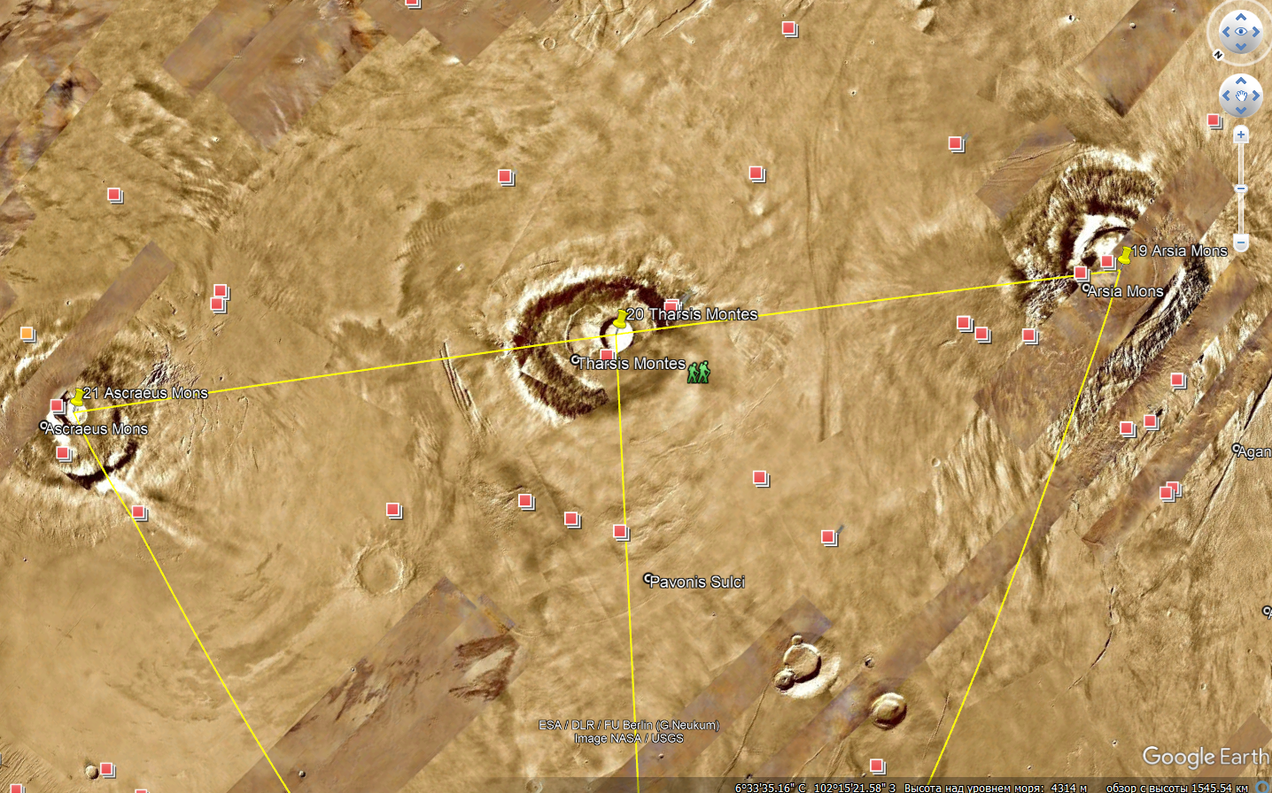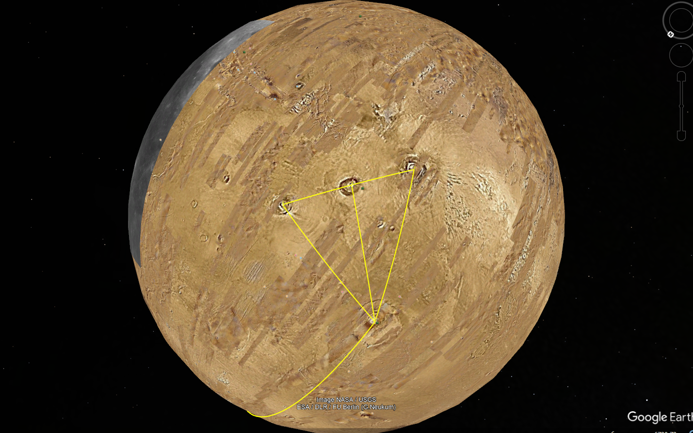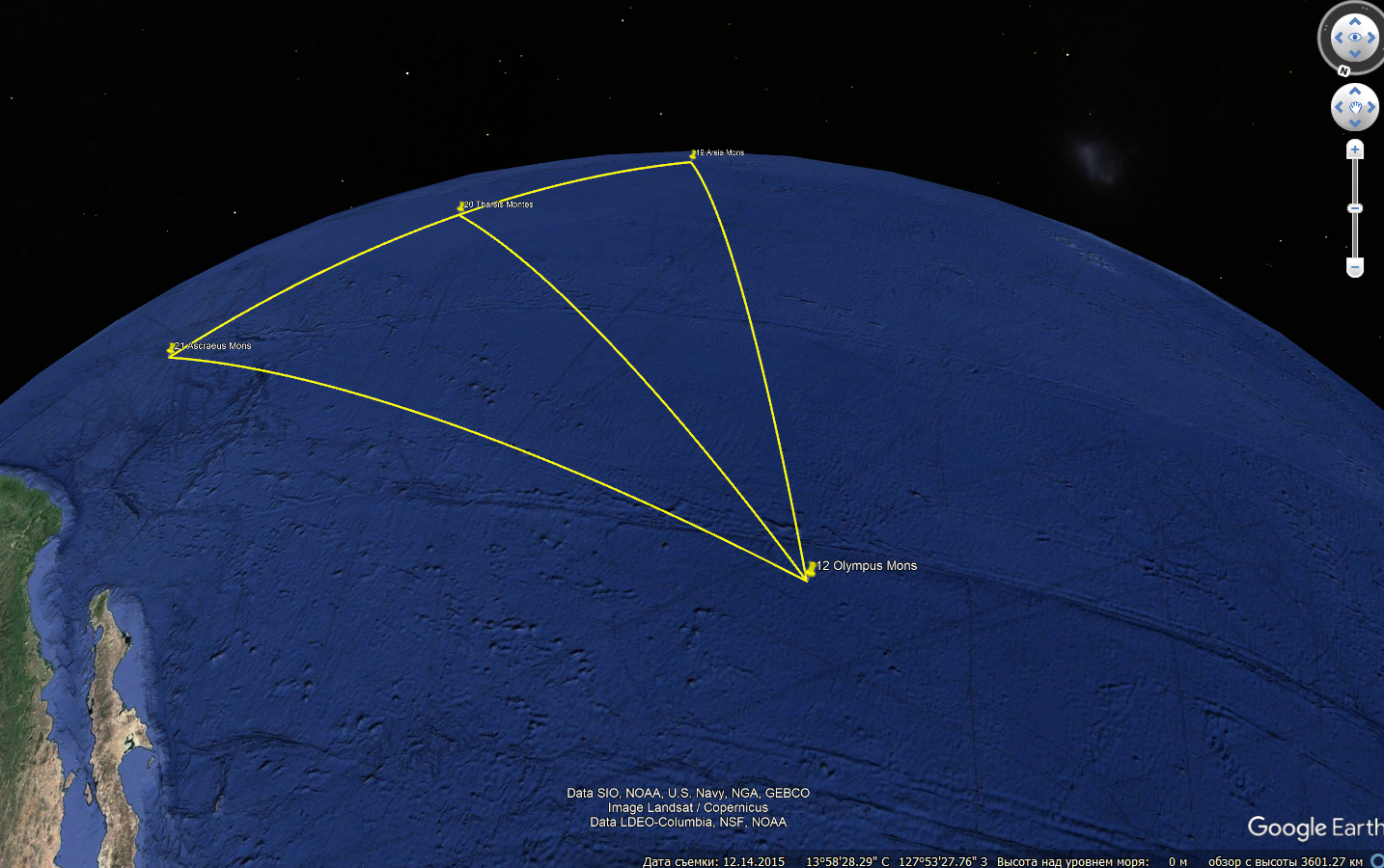 «Olympus Mons» – а ведь это метка известного вулкана на Марсе!..Как же это понимать? Объяснение такое. В программе Google Earth можно сохранять как метки объектов (в виде бочонков), так и нарисованные линии. Программа предназначена для просмотра Земли, или Марса, или Луны. И в этой программе есть недостаток, который оказался полезным, а именно: метки и линии не исчезают при смене модели (Земля, Марс или Луна). Поэтому земная Чебаркульская стрелка и привела к марсианскому вулкану Olympus Mons. Переключим программу на Марс и поправим «шарик» так, чтобы видеть новый треугольник (рис. 10).