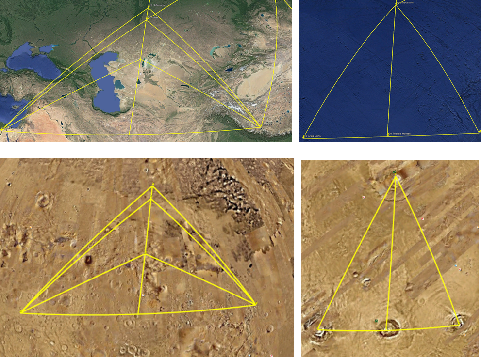 Сравнение сторон треугольников на разных планетах показало, что боковые стороны марсианского треугольника с вершиной в Olympus Mons (на картинке справа) равны по длине боковым сторонам среднего земного треугольника с вершиной в Аркаиме (на картинке слева). Речь идёт о сторонах земного треугольника Аркаим-Пирамида Хеопса и Аркаим-Кайлас. Погрешность равенства сторон марсианского треугольника с вершиной в Olympus Mons и земного треугольника с вершиной в Аркаиме не превышает 8%.