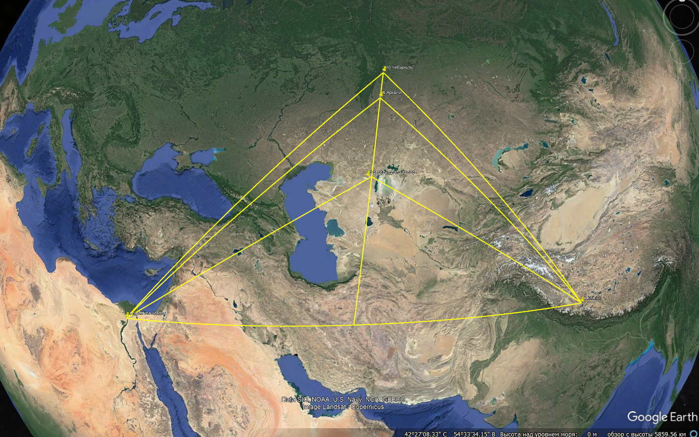 Здесь мы видим три построенных сферических треугольника – внешний и два внутренних. Основанием всех трёх треугольников является линия «Пирамида Хеопса-Кайлас».