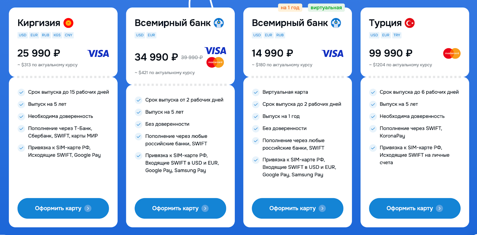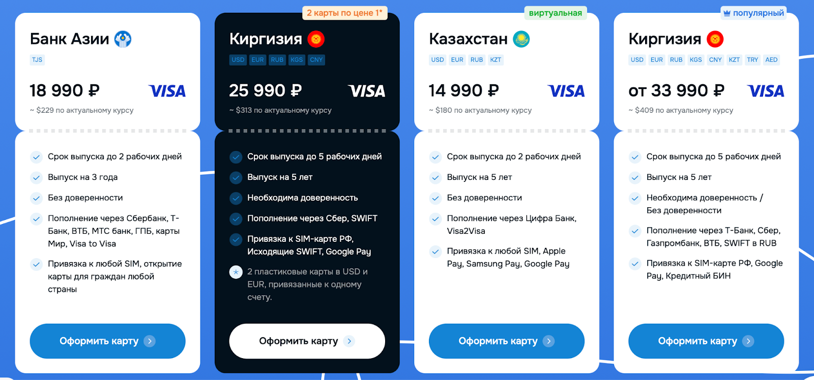 Выбор здесь довольно широкий. Есть, например, киргизская карта от Банка Азии, которая выпускается без доверенности и стоит около 18 990 рублей — бонусом идет сразу две карты на три года. Есть комплект «две карты USD/EUR» за 25 990 рублей, который требует доверенности и привязки к SIM-карте РФ, но поддерживает SWIFT и Google Pay.