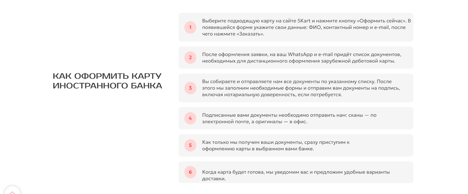 5КАРТ позиционируется как удобный способ получить зарубежную карту дистанционно, без поездок за границу. Сервис предлагает как пластиковые, так и виртуальные карты с полноценным функционалом: они работают через мобильное приложение, поддерживают Apple Pay и Google Pay, а интерфейс доступен на русском языке. Использовать такие карты можно для оплаты подписок, покупок в иностранных онлайн-магазинах, переводов и даже поездок.