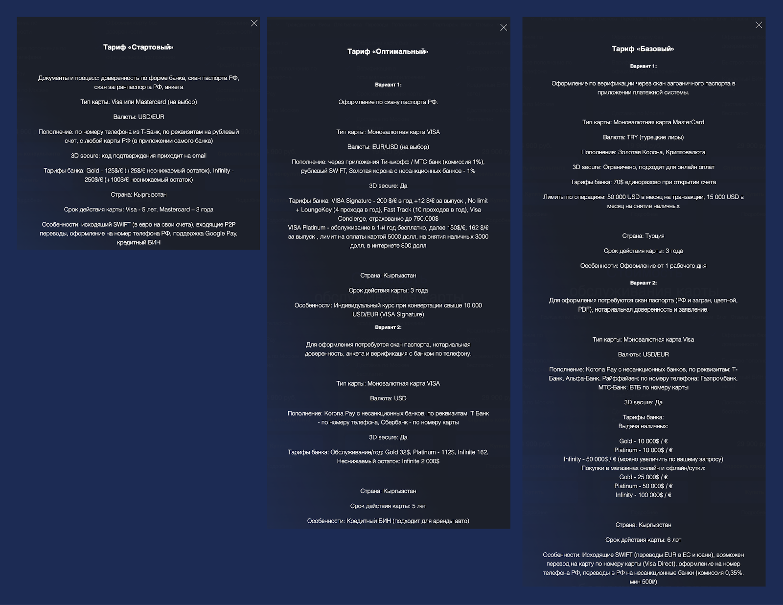 Ассортимент здесь построен вокруг разных банков СНГ, и у каждого тарифа свои условия. Есть моментальные карты без доверенности, которые можно выпустить за один день: тариф Gold стоит 19 900 рублей, действует три года и поддерживает валюты TJS, USD или RUB. Версия Platinum за 25 000 рублей имеет более высокие лимиты. Другие пакеты требуют доверенности и обрабатываются дольше: например, тарифы Gold и Platinum банка СНГ 1 стоят от 34 900 до 44 900 рублей и включают поддержку SWIFT. Есть и более дорогие варианты Infinite с расширенными лимитами.