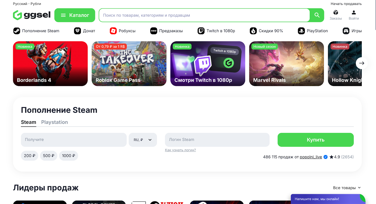 На сайте GGsel представлено огромное количество цифровых товаров — игры, внутриигровая валюта, подарочные карты, подписки на сервисы и программы. Здесь же можно оплатить ChatGPT, iCloud, Spotify или пополнить Steam. По сути, это маркетплейс цифровых товаров, где покупатель выбирает предложение, а продавцы конкурируют друг с другом.