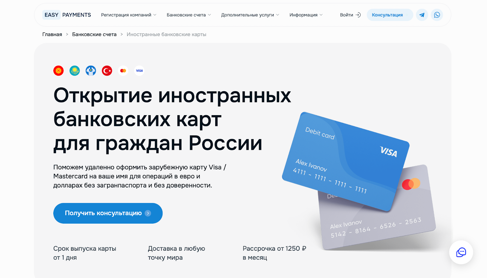 Easy Payments занимается оформлением пластиковых и виртуальных карт зарубежных банков. Основные направления — Киргизия, Казахстан, Турция и ряд других стран. Все операции выполняются дистанционно: достаточно предоставить документы, а готовую карту доставляют по почте. Карты можно подключить к Apple Pay и Google Pay, они подходят для онлайн-платежей и позволяют снимать наличные за границей. Часть тарифов требует доверенность, часть обходится простыми сканами паспорта.