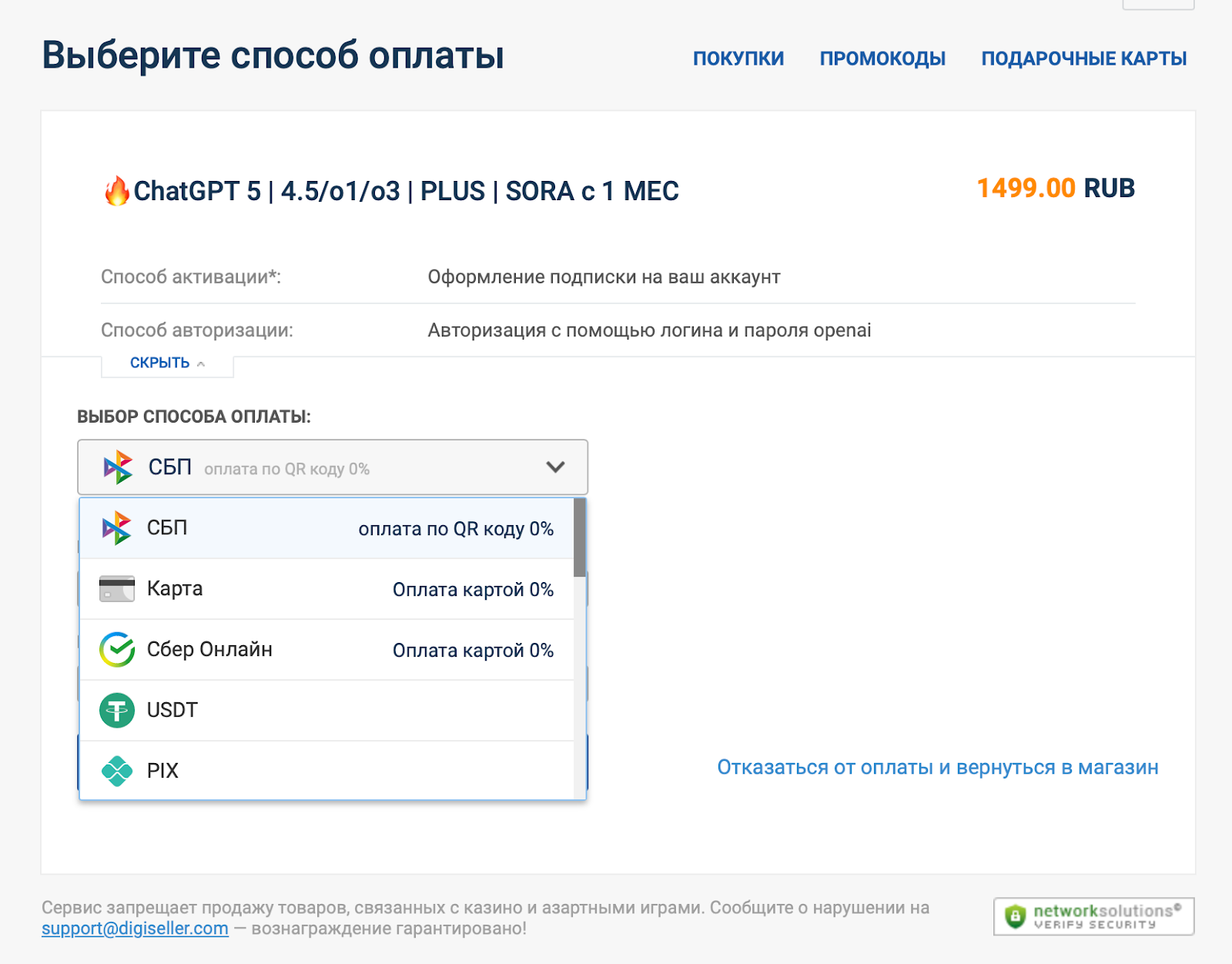 Преимущество очевидное — подписку можно оформить буквально за пару минут, и часто доставка происходит моментально. Оплатить получится через СБП, банковской картой, криптовалютой или другими электронными сервисами.