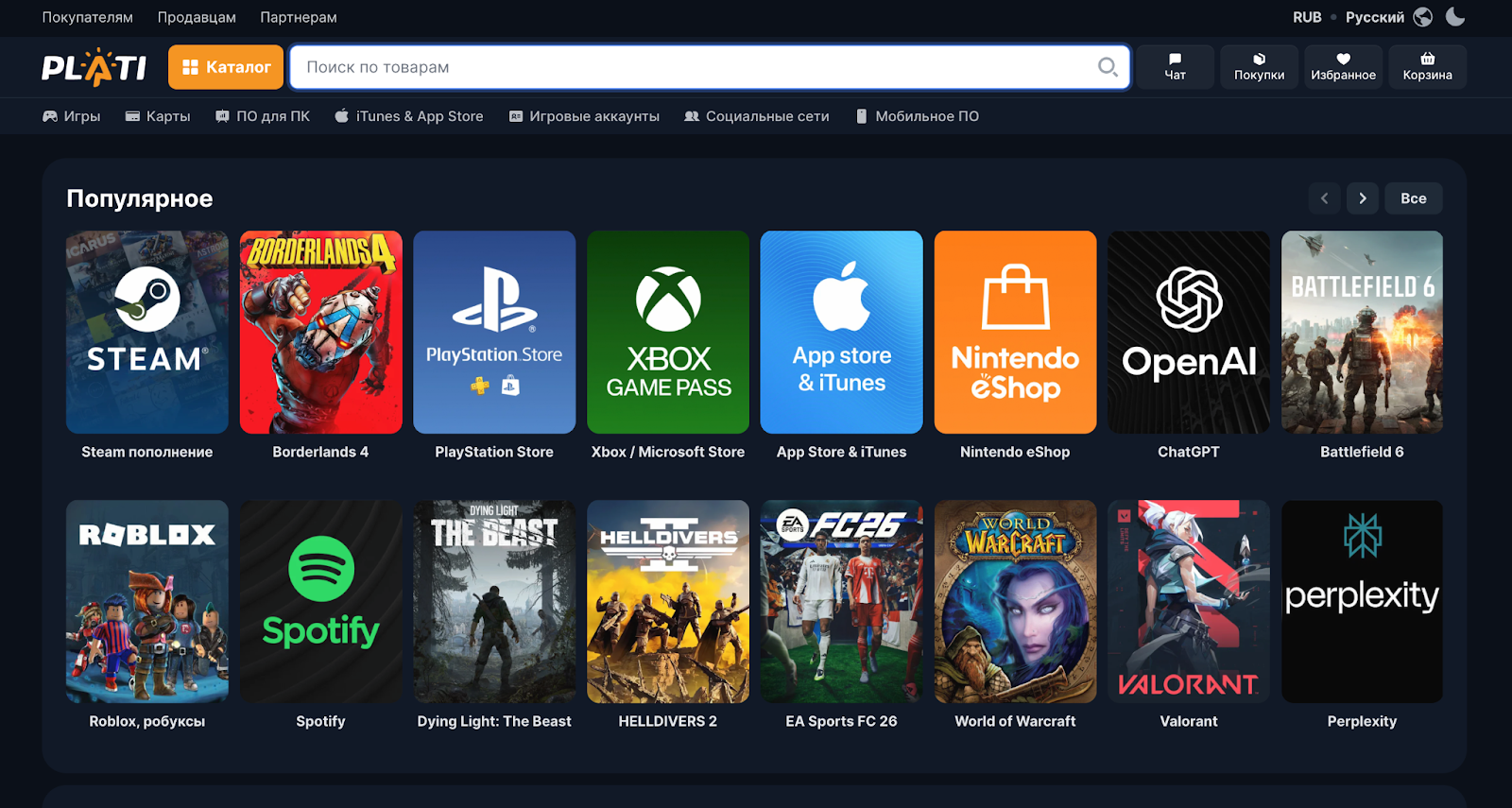 Plati — еще один крупный агрегатор цифровых товаров, который сводит покупателей и продавцов. Особенно популярен у геймеров: здесь быстро появляются новинки и всегда можно найти старую классику по выгодной цене. По сути, это онлайн-магазин цифровых продуктов, но сам Plati не является участником сделки: он лишь предоставляет площадку, а вся ответственность за качество товара лежит на продавце.