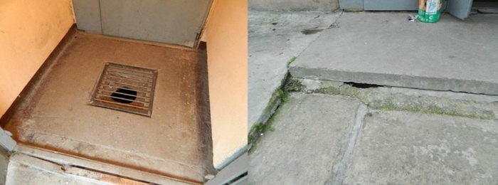 11. В тамбуре в полу имеется пробоина под решеткой, а также дыра под плитой перед подъездом.