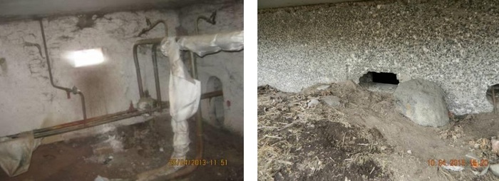 18. На вентиляционных продухах отсутствуют защитные сетки от крыс. На фото слева – вид из подвала, на фото справа – «парадный» вход для крыс с улицы.