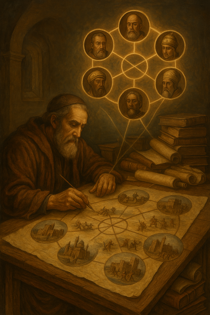 Представьте задачу: согласовать хронологию Иерусалима (пять фаз, десятки событий), хронологию халифата (Багдад, Каир, три дельты, двадцать правителей), хронологию Константинополя (императоры, соборы, войны) и папского Рима (папы, реформы, конфликты). Все эти слои переплетены через двойников, маски и причинные цепочки.