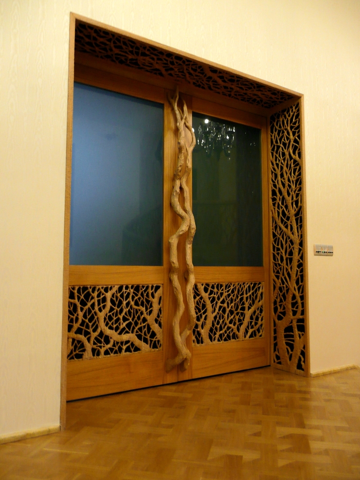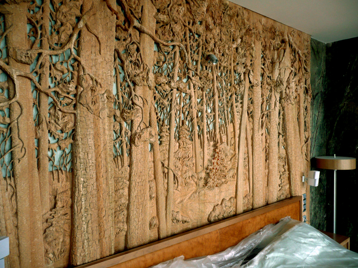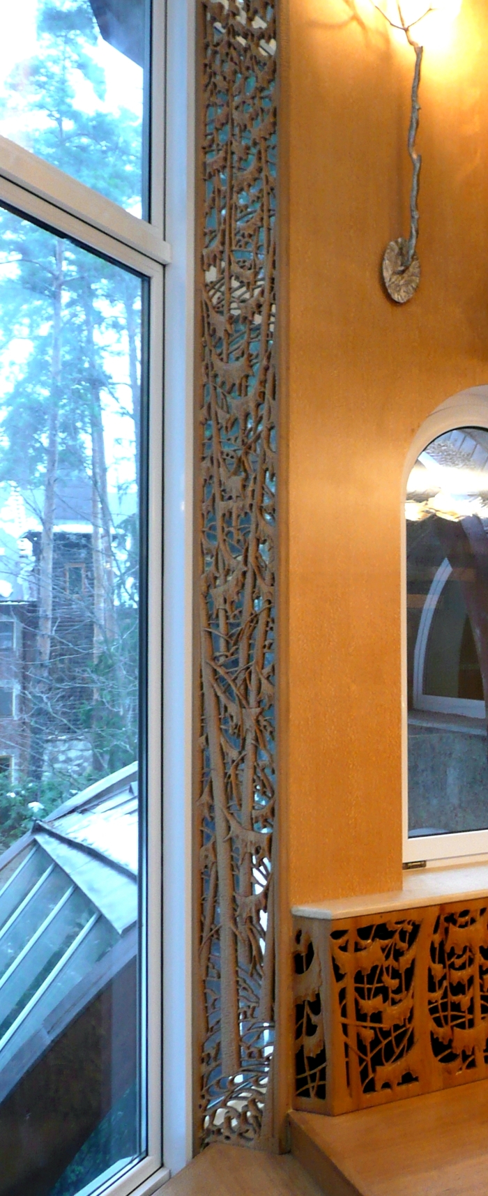 Окружающая природа стилизованная под резец, плавно переходила в элементы интерьера, дом по ходу работы начинал оживать. В композициях накладных панелей присутствуют разнообразные деревья со своим характером.