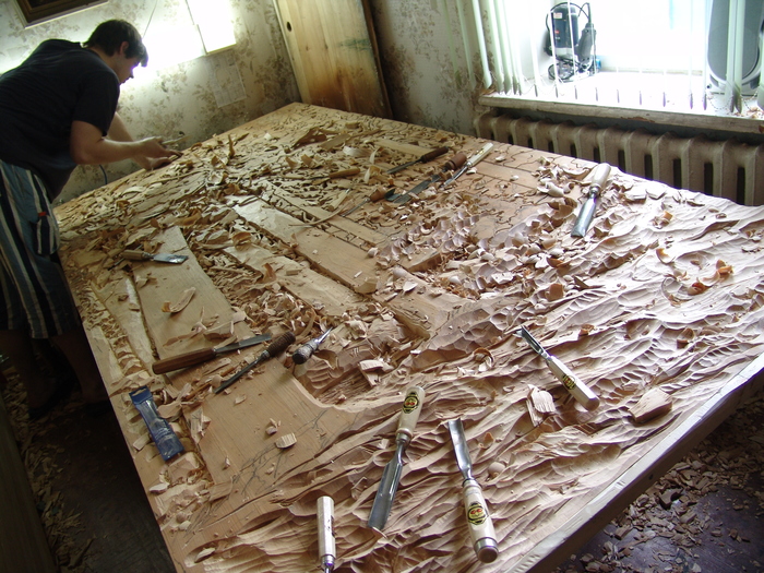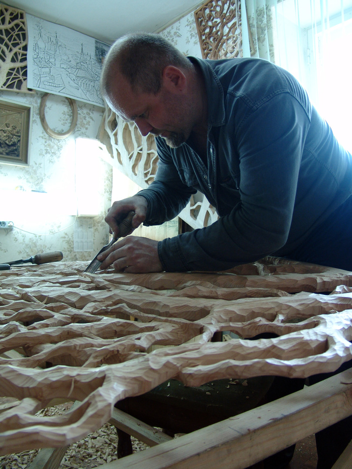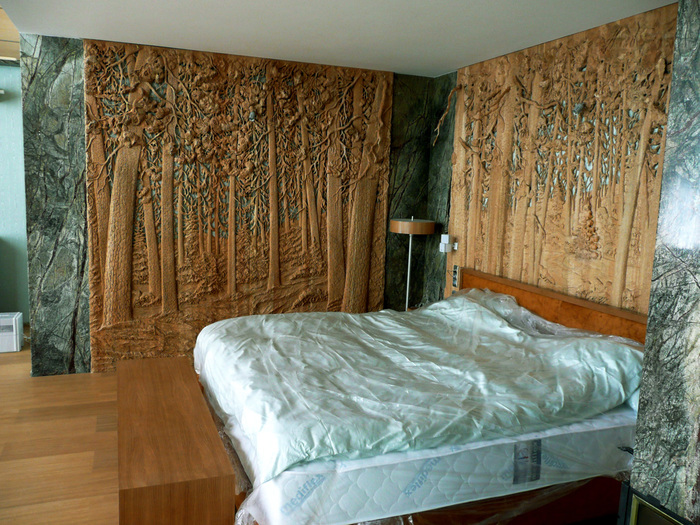 Во всем многообразии композиций и творческих решений, были выполнены действительно впечатляющие произведения, это два понно из кедра с композицией густого, если можно сказать "дремучего леса, они украшали изголовье кровати, по две стороны. Толщина щитов была около 5 см., покрытия защитными восками не проводились, заказчик хотел чувствовать ароматы материала. На изготовление двух панно ушло около года.