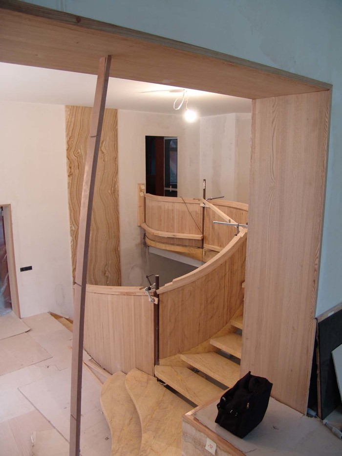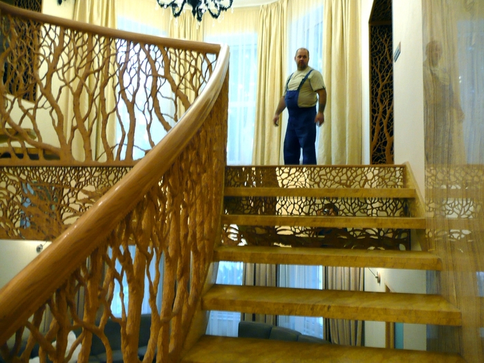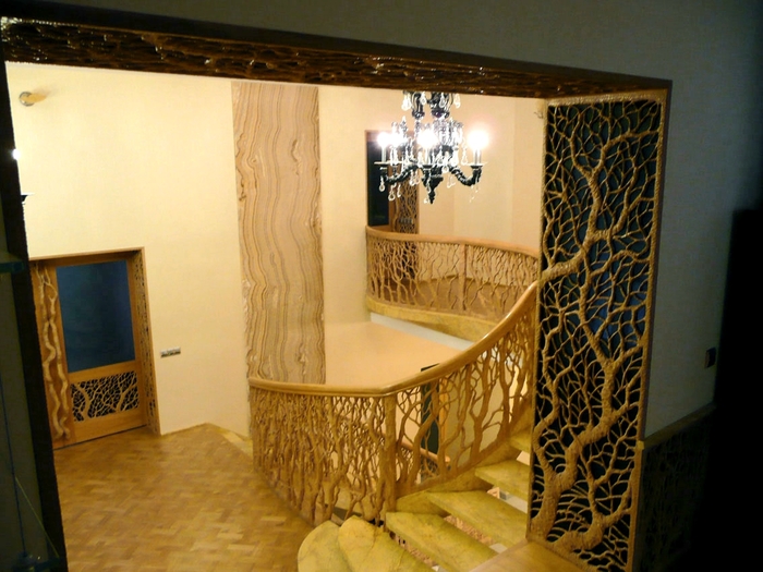Лестница была отдельным произведением, толщина щитов 6см. с изгибами пролетов. Четыре этажа ветвей подсвеченых лучами солнца, это позволило придать выразительный объем вьющихся ветвей. Определённая сложность была в перилах лестницы где индивидуально сводилась наклонная форма перила под анатомию руки, так как они были вклеены сразу монолитом с пролетами, которые к тому же имели изгиб.