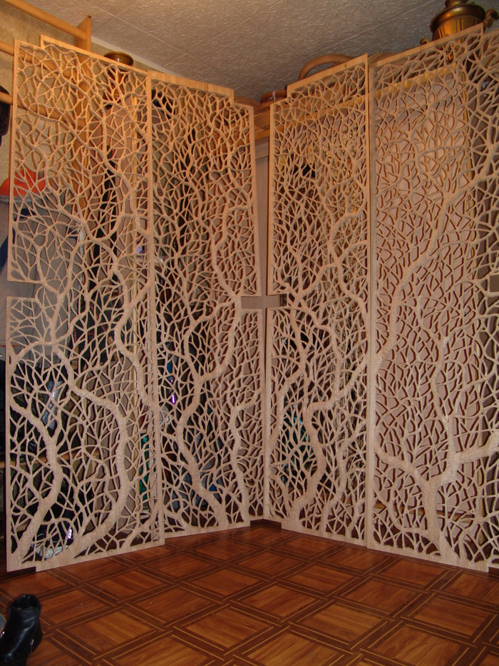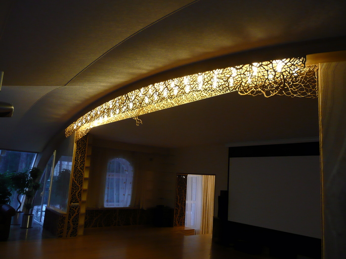 Во всем проекте дома толщина щитов и панно как правило не превышала 2 см. даже в этом обьеме удалось передать живость, природную красоту в ее изгибах. Каждый элемент в доме был отрисован вручную без повторений.
