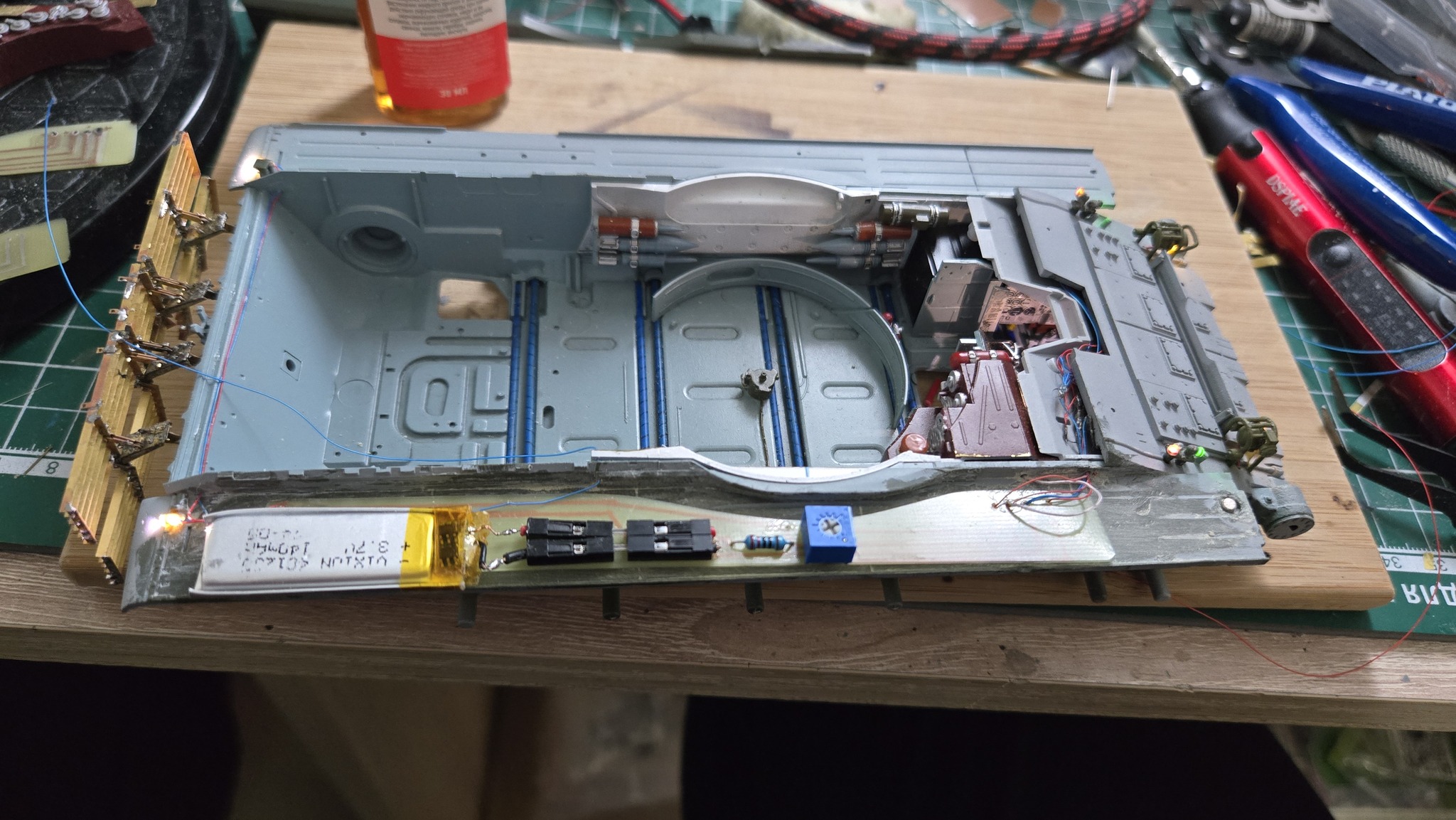Однако при финальном накидывании баков и верхней части корпуса было выяснено, что от АКБ мы избавляемся - не влезает буквально на миллиметр, а выпиливать уже некуда. Потому акб был отсоединён, а провода вынесены за опорные катки сзади, чтобы красиво и незаметно.