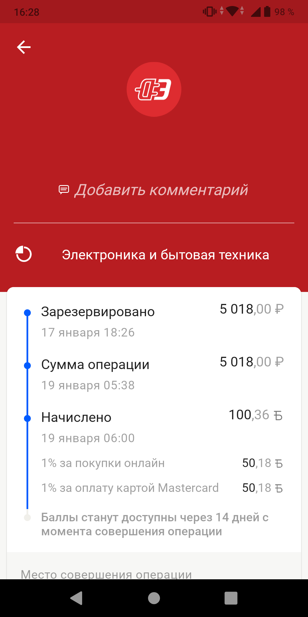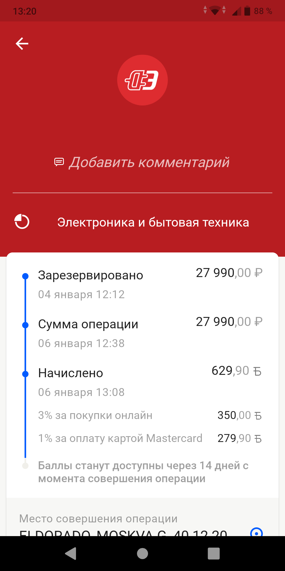Как видим имеется строка с 3% за онлайн. Вспоминаем школьный курс математики: 3% от 28000 это 840, а ни как не 350. Звоню в службу поддержки 7 января, оставил обращение, сказали, что разберемся. Через пару недель опять покупка в Эльдорадо (отцу в подарок телефон), здесь вообще тупо не начислили доп. бонусов.