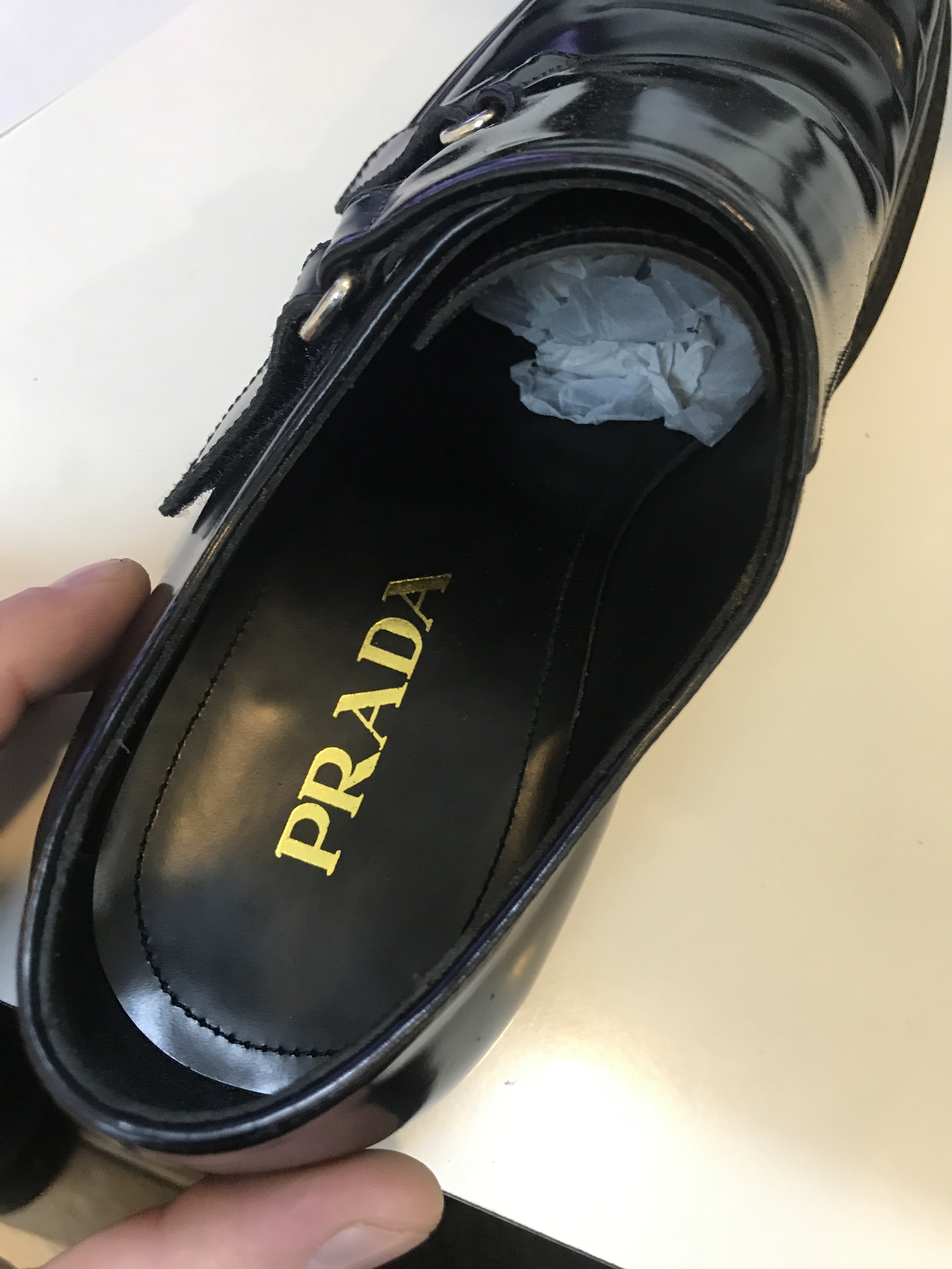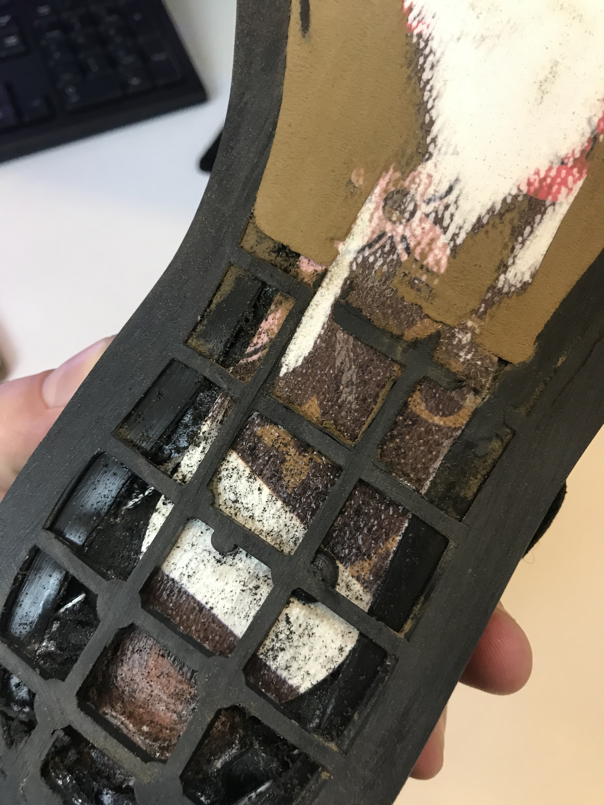 Стачиваем мы значит каблук полностью и подошву, флик за фликом... И тут во всей красе видим что то знакомое на вид! Важно то что до нас эту обувь Прада(это важно) никто не разбирал. И так внимание: