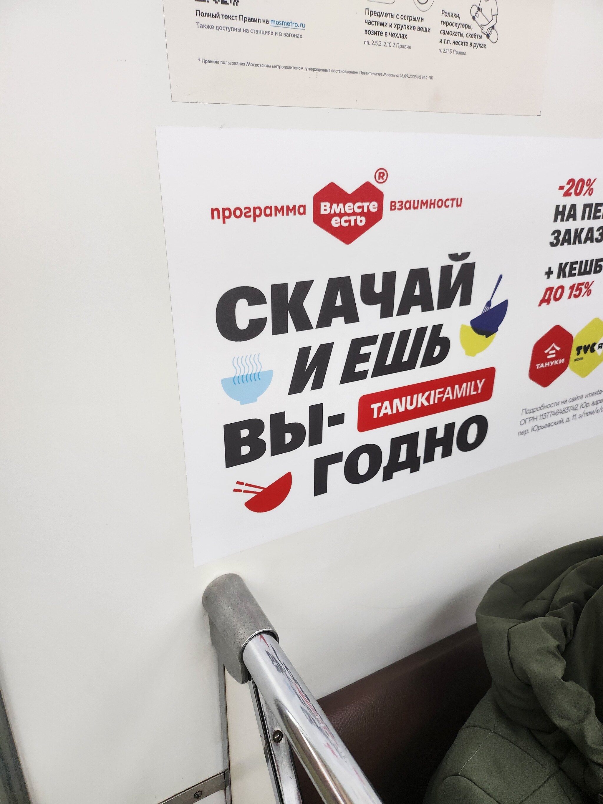 0 kelionredfox Интересная реклама 2 года назад По пути на работу заметил вот такой постер в метро. Возникли двойственные ощущения... [моё] Реклама Московское метро Тануки (сеть ресторанов) Подозрительно Ещё 0
