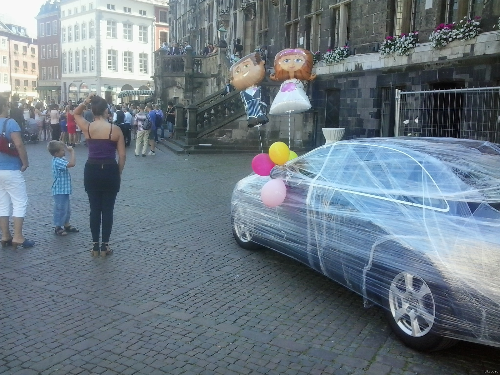 675 politehater Интересно, а что подарили молодым? 10 лет назад На площади в городе Аахен, Германия. Проходил мимо и увидел свадьбу. Вот как упаковали подарок. [моё] Свадьба Подарки