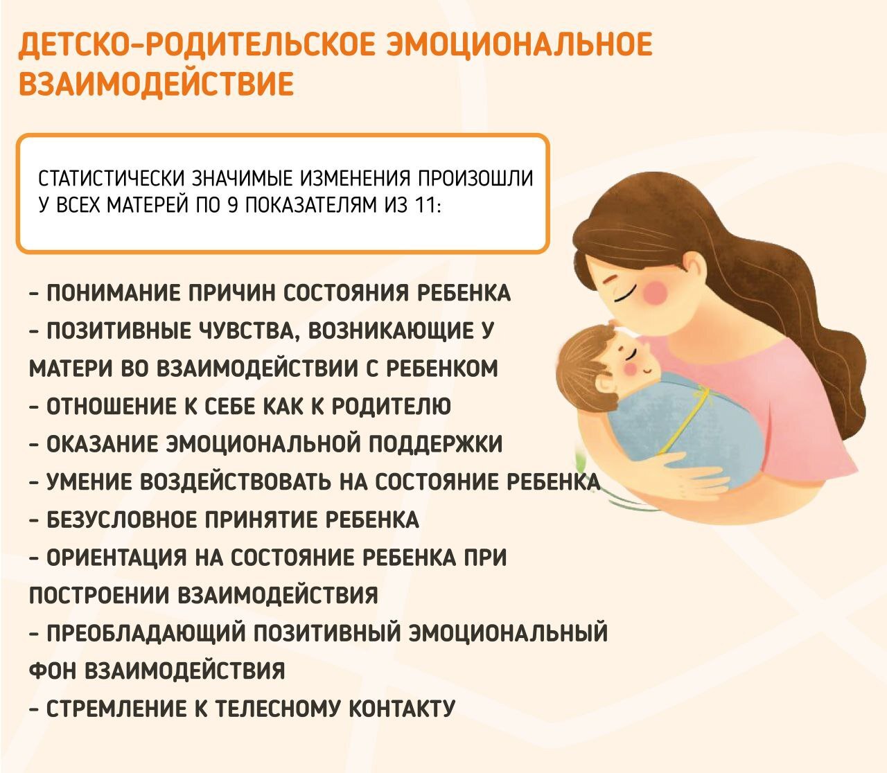 Что касается детско-родительского эмоционального взаимодействия статистически значимые изменения произошли у всех матерей по 9 показателям из 11: понимание причин состояния ребенка, позитивные чувства, возникающие у матери во взаимодействии с ребенком, отношение к себе как к родителю, оказание эмоциональной поддержки, умение воздействовать на состояние ребенка, безусловное принятие ребенка, ориентация на состояние ребенка при построении взаимодействия, преобладающий позитивный эмоциональный фон взаимодействия, стремление к телесному контакту.
