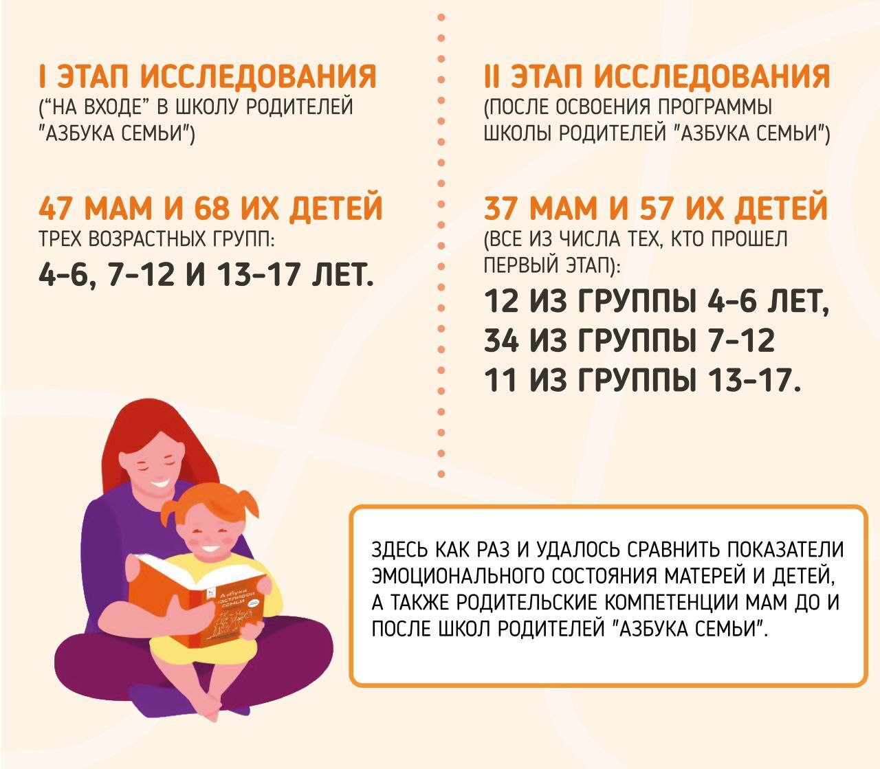 Здесь как раз и удалось сравнить показатели эмоционального состояния матерей и детей, а также родительские компетенции мам до и после школ родителей "Азбука семьи".