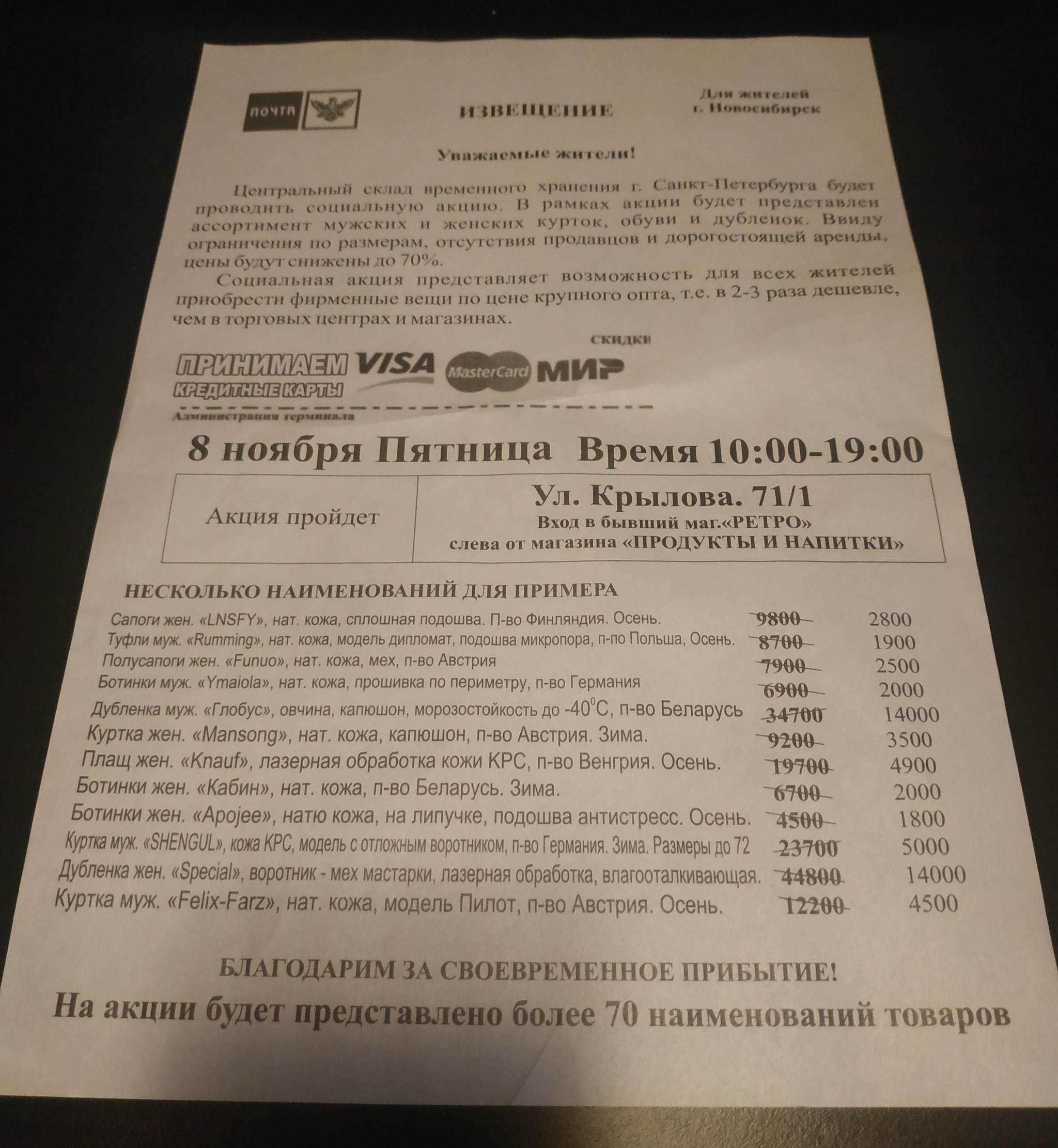 10 Ni051 Интересное извещение 6 лет назад Моя жена сегодня утром принесла корреспонденцию. Среди бумаг обратил внимание на извещение с логотипом почты России. Почти логотип почты России. Вот мне интересно что там за вещи будут продаваться. Просто похоже на какое-то разводилово. [моё] Почта России Акции Распродажа Извещение