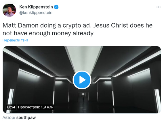 (Мэтт Дэймон рекламирует криптообменник. Господи, ему что, денег не хватает?)