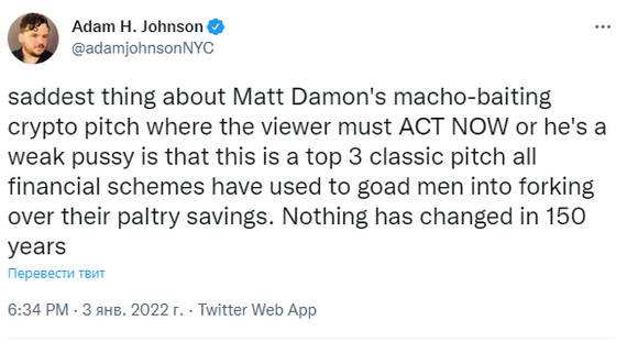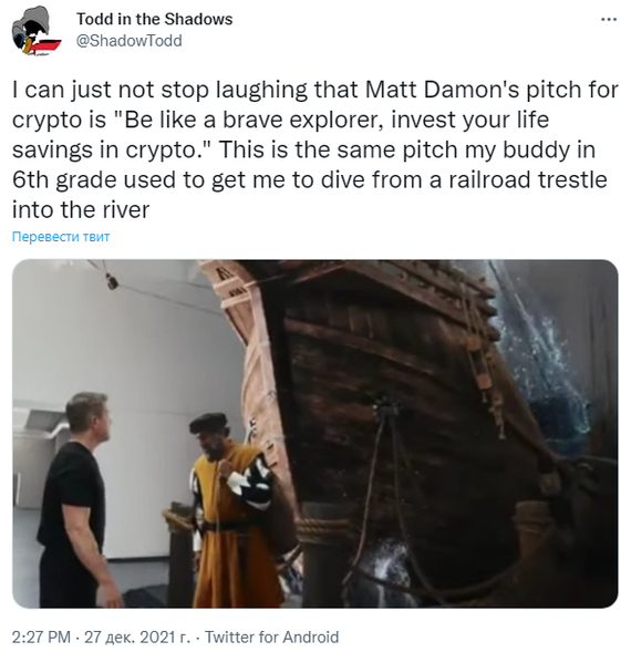 (Не могу перестать ржать с того, как Дэймон рекламирует крипту: «Будь как храбрый исследователь, инвестируй свои сбережения в криптовалюту». Подобными словами мой приятель в шестом классе уговаривал меня прыгнуть с железнодорожного моста в реку.)