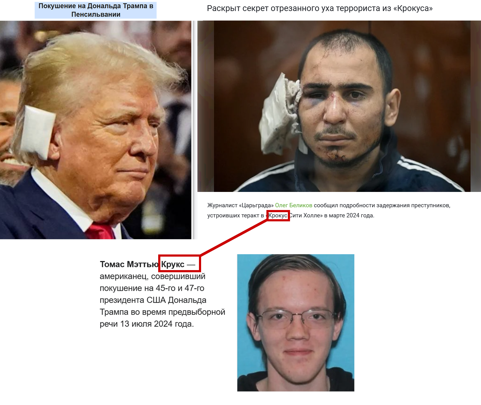 За 4 месяца до покушения на трампа - террористу с Крокус Сити - отрезали ухо, когда его ловили. На Трампа же совершил покушение человек с фамилией Крукс.