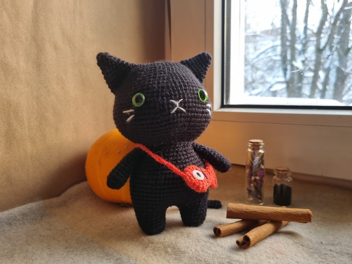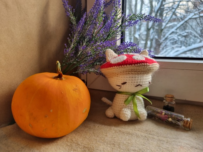 Этот котик-мухомор живет у меня с августовской ярмарки. У него была шляпка чуть меньше, чем у собрата, поэтому он так и не нашёл себе дом.