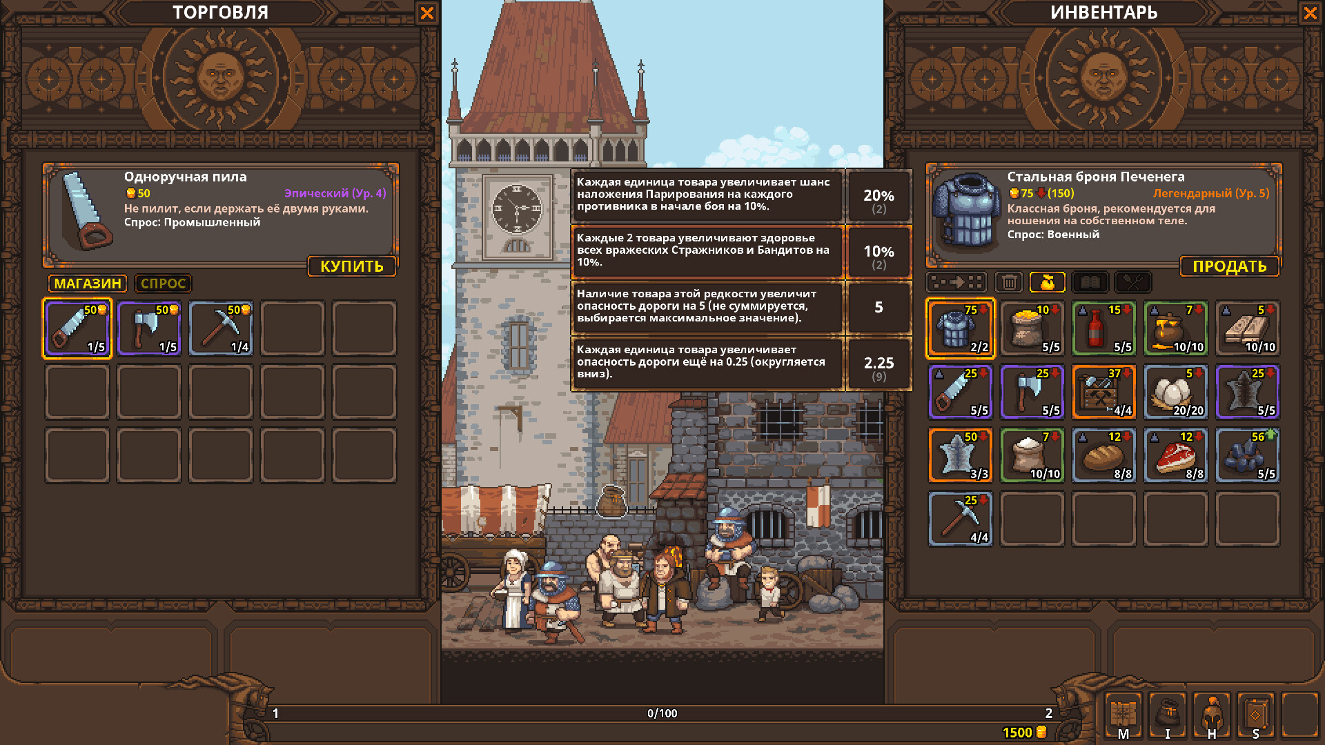 Есть разнообразная прокачка. «Магия» караванщика, тактики наемников, способностей к найму разных видов (кабаны, волки, медведи) и разных градаций (зеленые, синие, фиолетовые), прокачка поварского искусства. И другое.